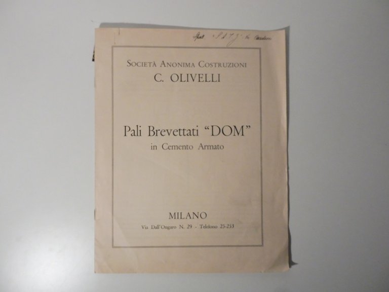 In 8 (cm 22,5 x 28,5), pp. (8). Nome manoscritto al piatto anteriore. Brossura editoriale. Illustrazioni nel testo. Brochure non datata, ma ascrivibile agli anni Cinquanta, relativa a questo sistema di pali brevettati Dom della Ditta C. Olivelli.