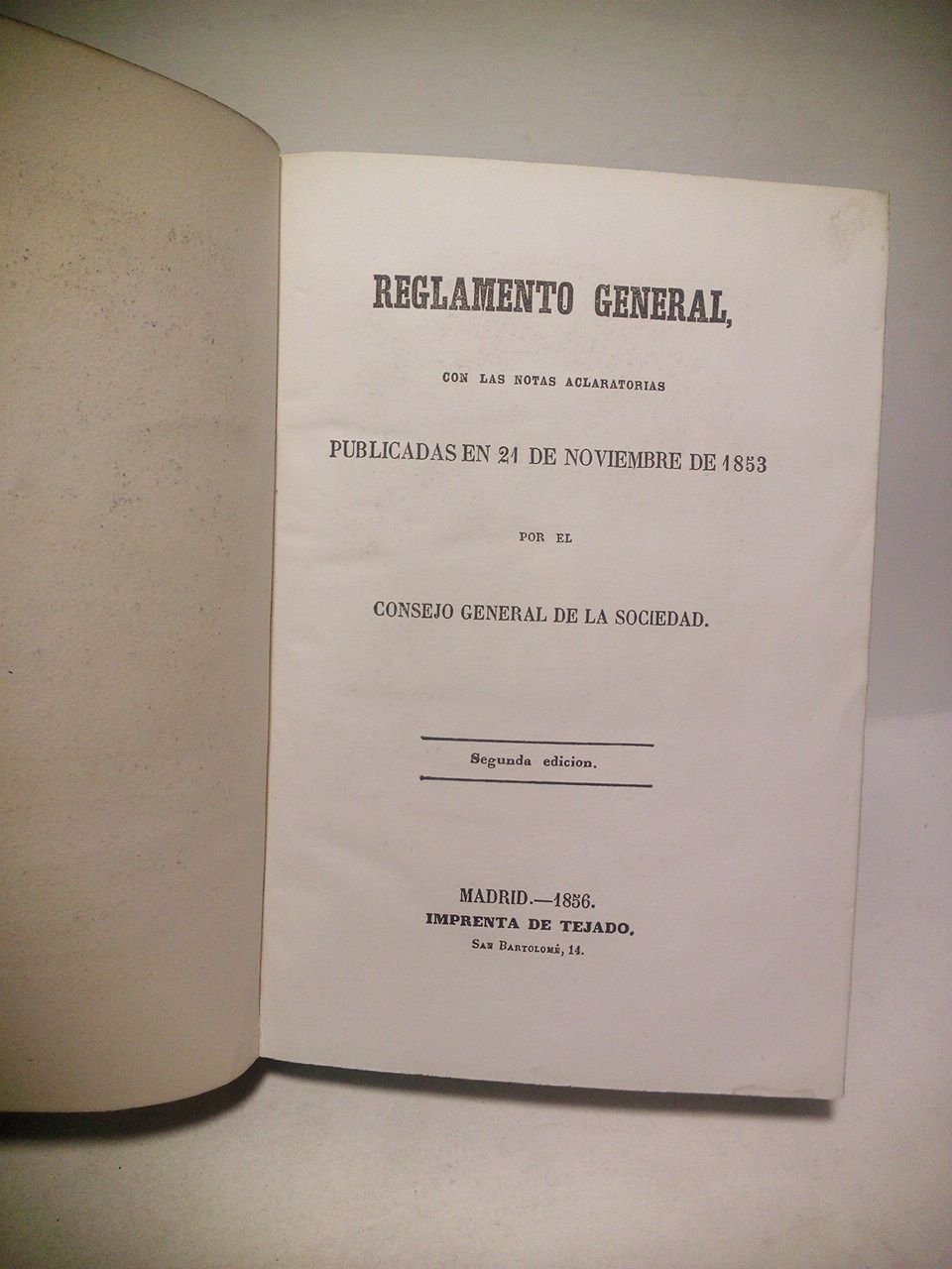 2ª Ed.- Madrid: Imp. de Tejado, 1856.- 138 p.: Grabado in frontis con el retrato de S. Vicente de Paul grabado al cobre por Franz Keller sobre una pintura de Francois Simon. [JUNTO CON] Discurso pronunciado por el Presidente del Consejo de la Sociedad de S. Vicente de Paul de Madrid, en la reunión general celebrada el día 8 de Diciembre de 1851 por la noche.- Burgos: Imp. de Polo, 1852.- 16 p. [JUNTO CON] Discurso leído por el Presidente del.idem., en la reunión general celebrada en Madrid el 29 de Febrero de 1852.- Madrid: Imp. de Tejado, 1954.- 23 p. [JUNTO CON] Discurso leído por el Presidente del.idem., en la reunión general celebrada en Madrid el 25 de Abril 1852.- Madrid: Imp. de S. Compagni, 1854.- 12 p. [JUNTO CON] Discurso leído por el Presidente del.idem., en la reunión general celebrada en Madrid el día 13 de Febrero de 1853.- Madrid: Imp. de Eusebio Aguado, 1853.- 12 p. [JUNTO CON] Discurso leído por el Presidente del.idem., en la reunión general celebrada en Madrid el 8 de Diciembre de 1853.- Madrid: Imp. de S. Compagni, 1854.- 10 p. [JUNTO CON] Discurso leído por el Presidente del.idem., en la reunión general celebrada en Madrid el 30 de Abril de 1854.- Madrid: Imp. de Tejado, 1854.- 19 p. [JUNTO CON] Discurso leído por el Presidente del.idem., en la reunión general celebrada en Madrid el 8 de Diciembre de 1854.- Madrid: Imp. de Tejado, 1855.- 19 p. [JUNTO CON] Discurso leído por el Presidente del.idem., en la reunión general celebrada en Madrid el 22 de Julio de 1855.- Madrid: Imp. de Tejado, 1855.- 16 p. [JUNTO CON] Discurso leído por el Presidente del.idem., en la reunión general celebrada en Madrid en 8 de Diciembre de 1855.- Madrid: Imp. de Tejado, 1855.- 18 p. [JUNTO CON] Sociedad de S. Vicente de Paul. Noticia de los principales sucesos relativos á la misma, que han tenido lugar en Roma en los meses de Diciembre de 1854 y Enero de 1855.- Madrid: Imp. de Tejado, 1855.- 39 p. [JUNTO CON] Sociedad de S. Vicente de Paul. Acta de la Junta general celebrada en Madrid em 22 de Julio de 1855.- [S.l., Madrid?]: [ s.n.], [1855]. [JUNTO CON] Sociedad de S. Vicente de Paul. Acta de la Junta general celebrada en Madrid en 8 de Diciembre de 1855.- Madrid: Imp. de Tejado, 1855.- 14 p. [JUNTO CON] Instrucciones acerca de las reglas que deberán seguirse para la formación de las Conferencias de San Vicente de Paul.- Madrid: Imp. de Tejado, 1855.- 16 p.- Todos en 8º(17 x 12 cm); Encuadernados juntos en un solo Volumen en Plena Piel Pasta Española de la época, lomo liso con tejuelo y grecas doradas.- Importante conjunto de documentos para el conocimiento de esta Sociedad caritativa en la España del siglo XIX.* HISTORIA DE LA IGLESIA CATÓLICA, PATRÍSTICA Y PENSAMIENTO CATÓLICO EN GENERAL