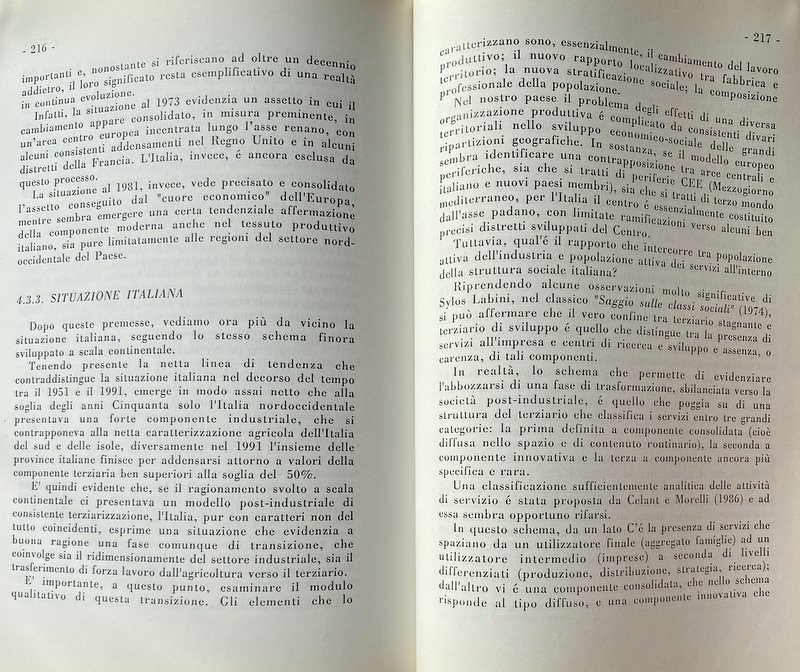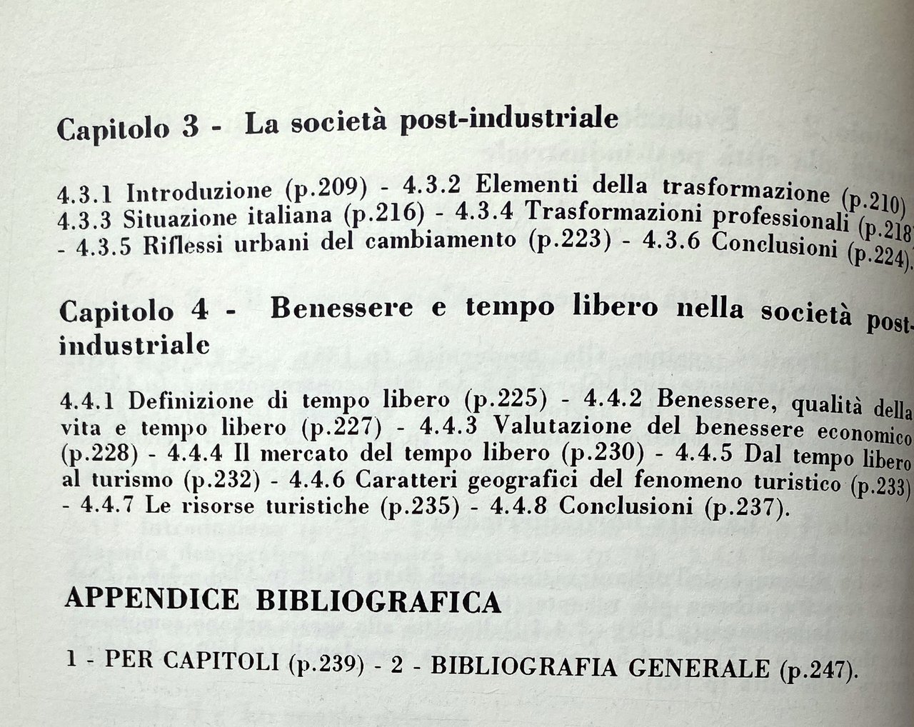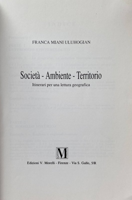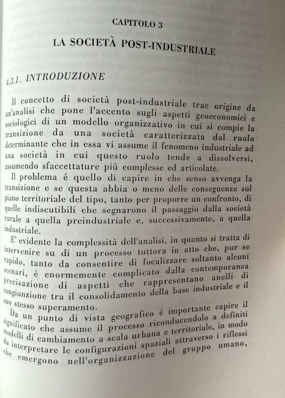 Il lavoro si conclude, poi, con l'analisi dei rapporti tra società e territorio in una prospettiva geo-economica rivolta alla considerazione del nostro Paese nel quadro dell'Europa comunitaria e nell'evoluzione del modello organizzativo della società post-industriale. Proponendosi di indicare un itinerario per la lettura geografica dei fenomeni analizzati, il libro si conclude con una bibliografia di specifico riferimento ai singoli capitoli e di carattere generale, alle quali il lettore attento troverà utile rifarsi.