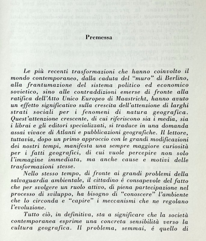 Premessa. Le più recenti trasformazioni che hanno coinvolto il mondo contemporaneo, dalla caduta del "muro" di Berlino, alla frantumazione del sistema politico ed economico sovietico, sino alle contraddizioni emerse di fronte alla ratifica dell'Atto Unico Europeo di Maastricht, hanno avuto un effetto significativo sulla crescita dell'attenzione di larghi strati sociali per i fenomeni di natura geografica. Quest'attenzione crescente, di cui riferiscono sia i media, sia i librai e gli editori specializzati, si traduce in una domanda assai vivace di Atlanti e pubblicazioni geografiche. Il lettore, tuttavia, dopo un primo approccio con le grandi modificazioni dei nostri tempi, manifesta una sempre maggiore curiosità per i fatti geografici, di cui vuole percepire non solo l'immagine immediata, ma anche cause e motivi delle trasformazioni stesse. Nello stesso tempo, di fronte ai grandi problemi della salvaguardia ambientale, il cittadino è consapevole del fatto che per svolgere un ruolo attivo, di piena partecipazione nel processo di sviluppo, ha bisogno disconoscere l'ambiente che lo circonda e capire i meccanismi che ne regolano l'evoluzione. Tutto ciò, in definitiva, sta a significare che la società contemporanea esprime una concreta sensibilità verso la cultura geografica. Il problema, semmai, é quello di rispondere a tali sollecitazioni con adeguati strumenti; il primo dei quali non può che essere la formazione di una classe docente adeguatamente preparata ed aggiornata nello specifico geografico e capace di trasmettere tale sapere alle classi giovanili.