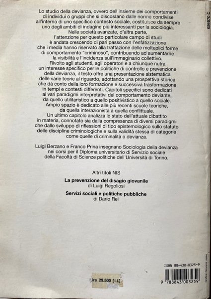 Gli autori propongono una presentazione sistematica delle varie teorie sulla devianza, adottando una prospettiva storica che dà conto della loro formazione e successiva trasformazione in tempi e contesti differenti. Capitoli specifici sono dedicati ai vari paradigmi interpretativi del comportamento deviante, da quello utilitaristico a quello positivistico a quello sociale. Un ultimo capitolo analizza lo stato dell'attuale dibattito in materia. Berzano e Prina insegnano Sociologia della devianza nei corsi per il Diploma universitario di Servizio sociale della Facoltà di Scienze politiche dell'Università di Torino.