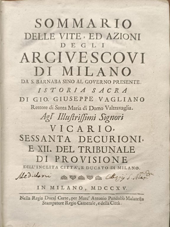 In-8 p. (mm. 208x165), piena pergamena coeva (segni duso alle cerniere), titolo manoscritto al dorso (a cordoni), tagli a spruzzo rossi, pp. XXIV, 468 (ma 472 perchè sono ripetute le pp. 433-436), 1 c. nn. Le pp. 440-468 contengono "Herbensis familae vulgò De Herba dictae", apud insubres florentissimae chronologica et genealogica monumenta. Testo ornato da una testata, alc. capilettera e finalini, silografati. "Edizione originale". <br>Cfr. Cat. Hoepli, 956 - Predari, p. 271 - Coleti,I, p. 115: Sommario.. sino al 1714 - Argelati, II, I, 1560.<br>Esemplare ben conservato..