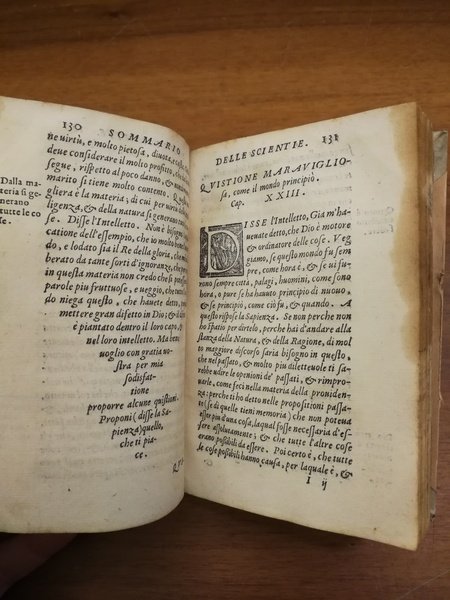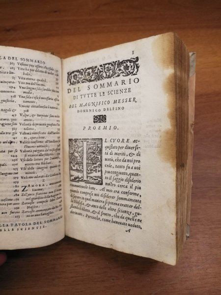 In-16 p. (mm. 153 x 103), mz. pergamena antica (risg. rifatti), 28 cc.nn., 360 pp.num., marca tipografica al frontespizio, ornato da testatine e grandi capilettera figurati a vignetta, tutti xilografati. Dedica di Lodovico Dolce a Nicolò Crasso, oratore. L'opera contiene molti argomenti curiosi ed interessanti (religione, politica, passioni, ragione, divinazione, magia); tra gli altri, nei capitoli III, IV, V, VI e XXVII tratta dell'aritmetica, della geometria, della musica, della astrologia, come precisa il Riccardi,I, 402. Ma il "Sommario".., attribuito al Delfino, è risultato essere una pura traduzione della Vision delectable de la philosofia y artes liberales" di Alfonso de la Torre, già stampata in Spagna nel 1480 o 1482.. Anzi, come osserva giustamente il Brunet, nemmeno gli spagnuoli dovettero ricordarsi che l'opera apparteneva alla loro letteratura, perchè si tradusse in spagnolo col nome del Delfino, e fu ripetutamente stampata! Così Bongi,I, p. 504-505.Questa ediz. del 1565 è quindi la "seconda edizione" della traduzione di Delfino (la prima giolitina è del 1556). Cfr. anche Palau,VII, p. 47 - Brunet,V,887.Su quasi tutto il volume pesante alone al solo margine esterno bianco (che man mano si attenua); alc. cc. con uniforme lieve arross.; a parte questi difetti, buon esemplare di questa rara opera.
