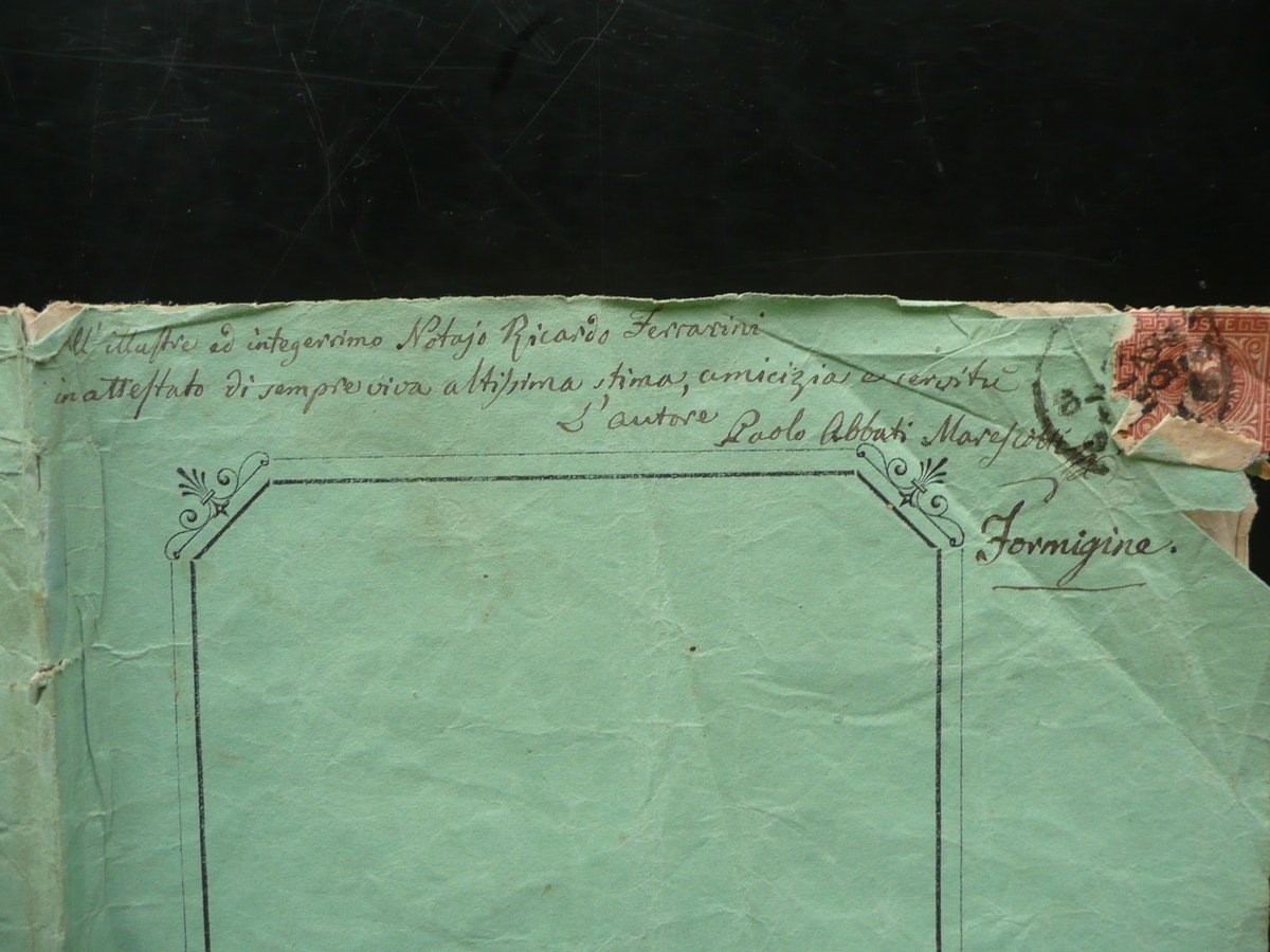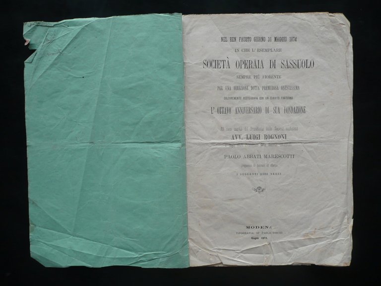 Paolo Abbati Marescotti, Nel ben fausto giorno 31 Maggio 1874 in che l'esemplare Società Operaia di Sassuolo sempre più fiorente per una direzione dotta premurosa onestissima solennemente festeggiava con un convito fraterno l'Ottavo Anniversario della sua fondazione Al raro merito del Presidente della Società Medesima Avv. Luigi Rognoni e degli altri Presidenti delle Società consorelle Paolo Abbati Marescotti pregiavasi di dedicare ed offerire i seguenti suoi versi Tipografia di Paolo Toschi, Modena, giugno 1874, cm 22,5x15,5, pp. 8, brossura ed. Margine sup. della br. ant. con timbretto, marca da bollo e dedica interamente autografa e firmata dall'Autore (vedi foto). Condizioni di conservazione Esemplare in modeste condizioni con tracce d'uso e del tempo, pieghe di conservazione, brossure con alcune leggere tracce di pieghe e poche piccole mancanze ai margini, br. post. con una mancanza di vari cm alla parte inf. (vedi foto). Interni con qualche piccolo lieve alone, alcune lievi stropicciature e tracce di pieghe; angoli con pieghette. Margine superiore della brossura ant. con una dedica interamente autografa e firmata dall'Autore. SC03.D10036 N