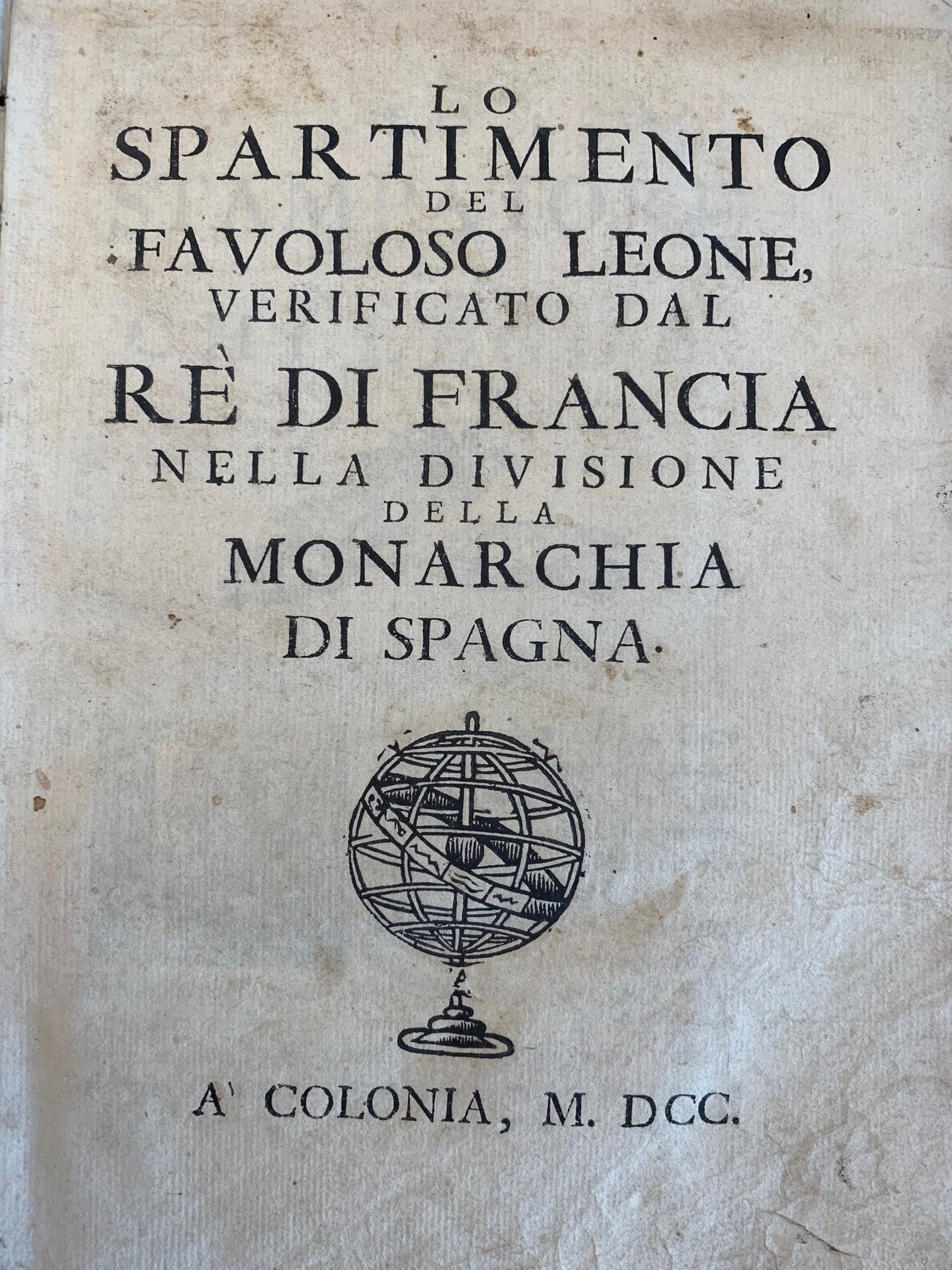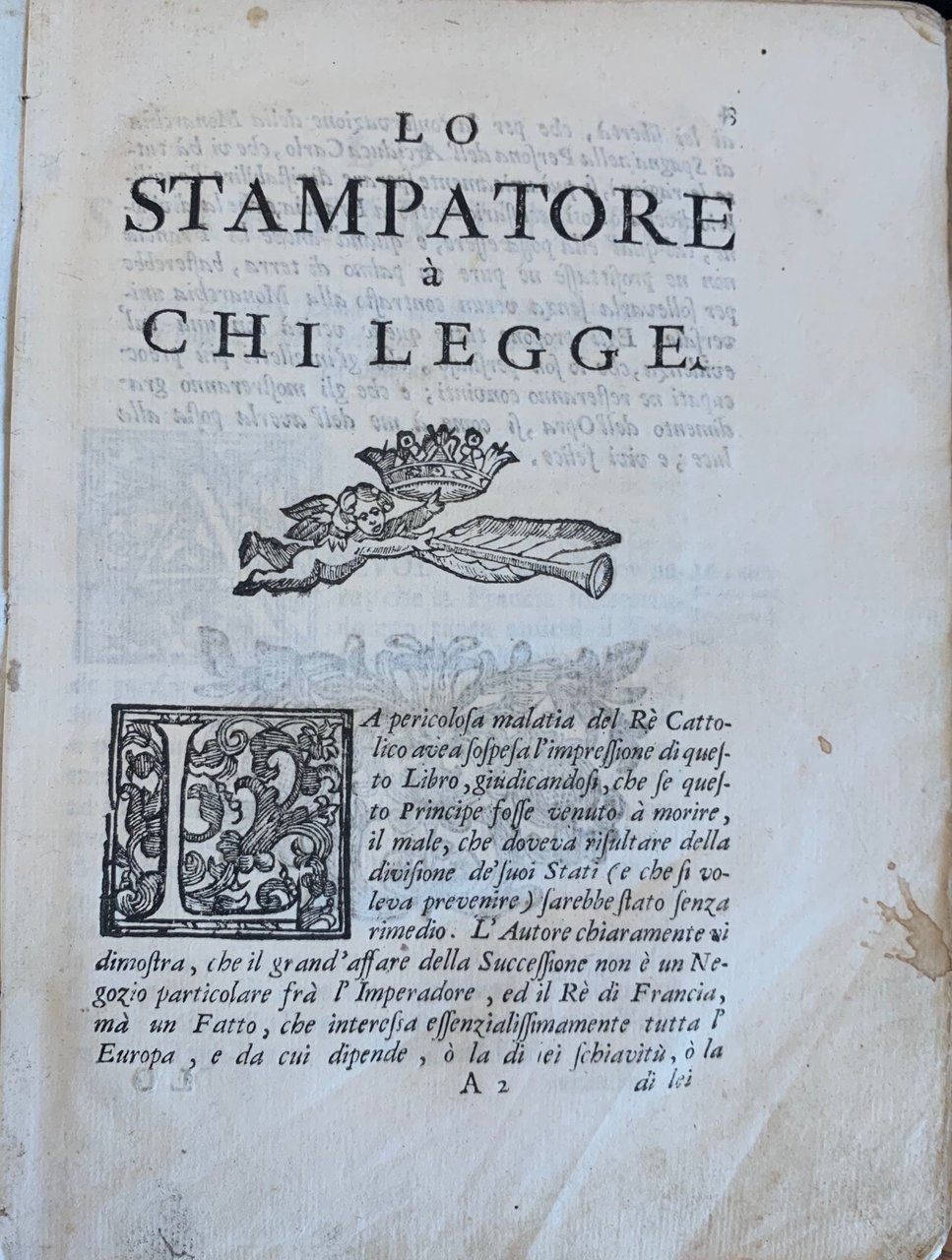 >2 parti in un volume in-4 piccolo (208x150 mm), pp. 84; 202; legatura coeva cartonato rustico. Vignetta xilogr. (planisfero) su entrambi i titoli, iniziali e fregi in xilografia. Prima edizione, stampata senza nome dell'autore e dello stampatore e col luogo, sicuramente falso, di Colonia. L'autore, lucchese, "consigliere imperiale aulico", racconta che Carlo II (1661-1700), ultimo degli Asburgo di Spagna, dopo aver pensato per un momento ad una spartizione dell'impero, nel suo ultimo testamento designò come erede universale Filippo di Francia, Duca d'Angiò, nipote di Luigi XIV e Maria Teresa di Spagna (ottobre 1700). Questo testamento, contestato dall'Austria, provocò la guerra di successione spagnola che si concluderà con i trattati di Utrecht e di Rastatt (1713-14). Bell'esemplare. Non in Parenti, Luoghi falsi. Melzi III, 85.