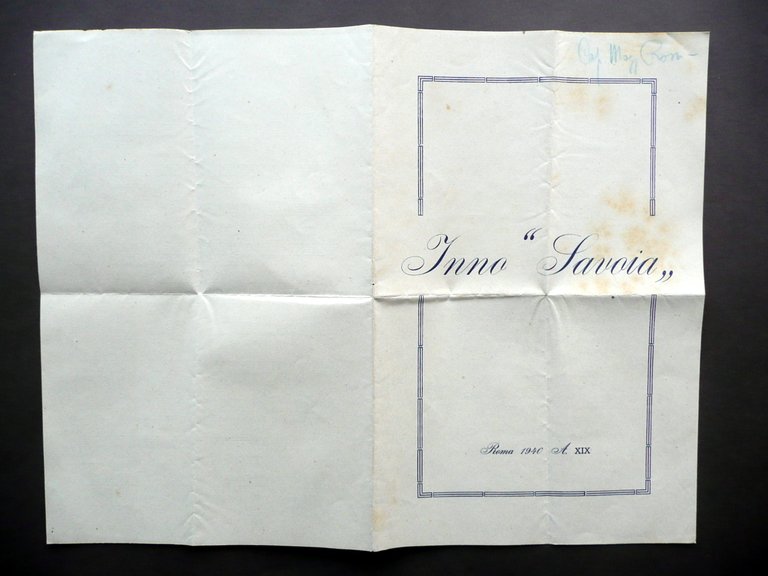 Spartito, Inno Savoia" Roma 1940, cm 27x17,5, pp. non num. (bifolio di pp. 4); margine sup. della prima pagina con nome del precedente proprietario annotato a pastello blu. Condizioni di conservazione Esemplare in buone condizioni con tracce d'uso, pieghe di conservazione, qualche piccola lieve brunitura. SC03.D11871 N "