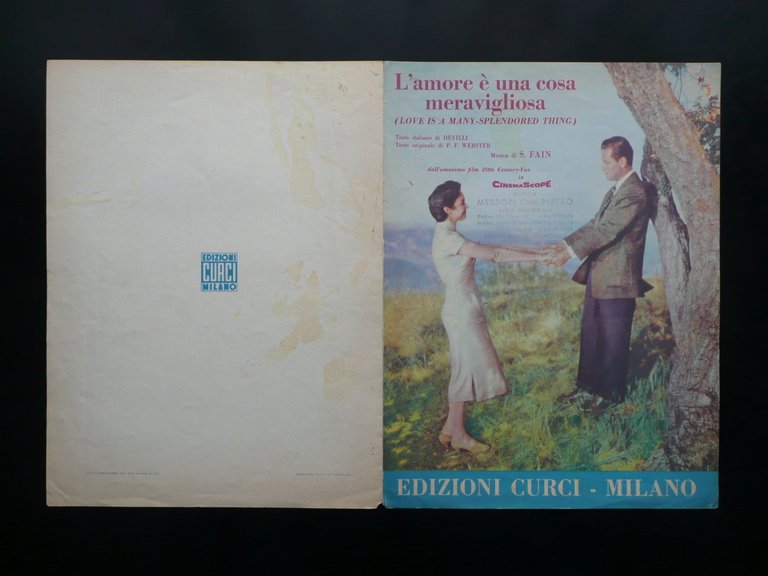 Spartito, L'Amore è una cosa meravigliosa" (Love is a many - splendored thing) testo italiano di Devilli Testo originale di P. F. Webster Musica di S. Fain dall'omonimo film 20th Century Fox in CinemaScope Edizioni Curci, Milano 1955, cm 31x23,5, pp. 4 (bifolio); copertina ill. a colori e con timbro del precedente rivenditore. Condizioni di conservazione Esemplare in buone condizioni con tracce d'uso, qualche lieve brunitura prevalentemente alla copertina post.; angolo inf. delle ultime due pagine con una lieve traccia di pieghetta; cuffie entrambe con uno strappetto di un paio di cm. SC03.D10225 N "