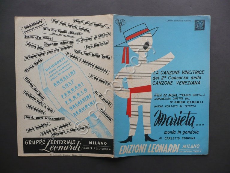 Spartito, La canzone vincitrice del 2° Concorso della Canzone Veneziana Jula de Palma, i Radio Boys" e l'orchestra diretta dal Maestro Guido Cergoli hanno portato al trionfo "Marietta. monta in gondola" di Carletto Concina Edizioni Leonardi, Milano 1954, cm 25x17,5, pp. 4 (bifolio), copertina ill. a colori. Condizioni di conservazione Esemplare in buone condizioni con tracce d'uso, copertina con qualche minima brunitura, angoli con trascurabili difetti. SC03.D9861 N "