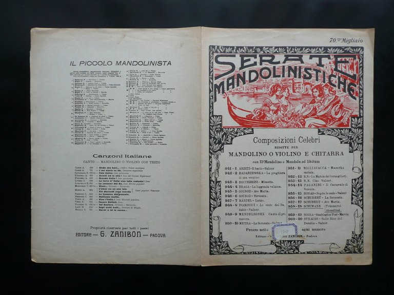 Spartito, Serate Mandolinistiche Composizioni celebri ridotte per mandolino o violino e chitarra con il mandolino o mandola ad libitum - Sogno" e "Canto della Sera" di R. Schumann Editore Guglielmo Zanibon, Padova, s. d. (anni '30 del Novecento), cm 35x25, pp. 4 (bifolio); copertina con bella cornice ill. in bicromia (vedi foto). Margine inf. con applicata etichetta recante il prezzo annotato a mano. Condizioni di conservazione Esemplare in buone condizioni con tracce d'uso, poche leggerissime bruniture; angoli con minimi difetti e tracce di piccole pieghette. SC03.D10229 N "