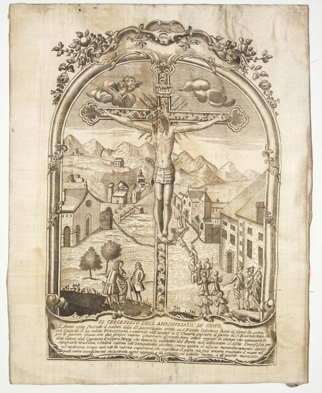 >Incisione in rame impressa su seta, mm. 370 x260 e ampi margini. Composizione di arte popolare, ma raffinata e piacevolissima, di anonimo artista. Raffigura il Cristo in croce e la veduta della località alle sue spalle con scena del miracolo del 1529 in S. Pietro Celestino fuori di Como. Nella parte inferiore del rame vi è la lunga legenda su otto righe. Incisione insolita e certamente eseguita in pochissimi esemplari su seta, preziosa e molto rara. Perfettamente conservata. Manca all'Arrigoni-Bertarelli, Piante e Vedute della Lombardia (capitolo su Como e provincia) e ad altre raccolte consultate.