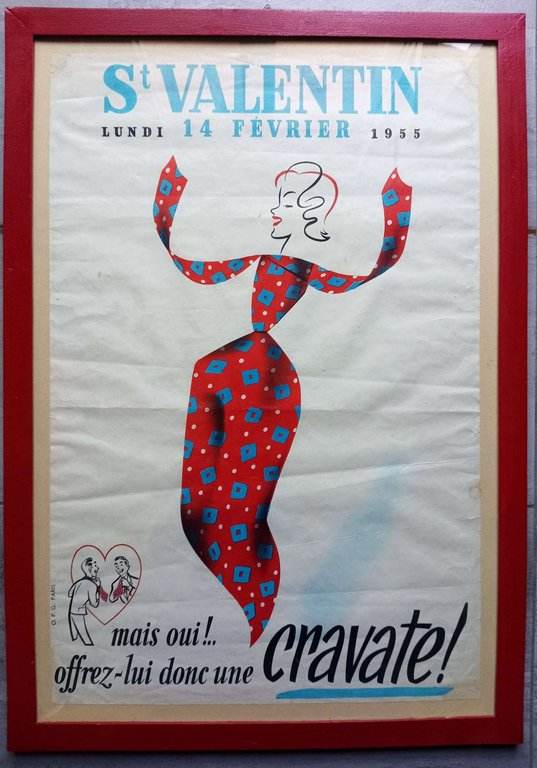 >Manifesto originale (mm 590 x 390), con cornice rossa; ed. OPG, Parigi, 1955. Litografia pubblicitaria per St. Valentino. Silouette di donna abbigliata con una cravatta a mo' di abito. In alto centrale: "St. Valentin, lundi 14 février 1955". In basso, "Mais oui!.. Offrez-lui donc une cravate!". Piccoli restauri agli angoli.