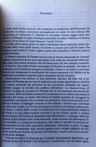 La storia delle teorie musicali, nel considerare la produzione dell'Ottocento, ha focalizzato la propria attenzione principalmente su autori di area tedesca. Questo saggio vuole contribuire ad allargare il campo di indagine prendendo in esame l'estetica e la teoria armonica di un autore di lingua francese: Camille Durutte. Criticata da Fétis e da Riemann per il carattere spiccatamente algoritmico, apprezzata da Gounod e da Gevaert per la profondità e gli alti ideali ispiratori, segnalata da d'Indy tra i contributi teorici più importanti dell'Ottocento francese, la Technie harmonique di Durutte costituisce un tentativo organico di fondare l'armonia classico-romantica, da Bach a Wagner, su basi rigorosamente matematiche. Senza ricorrere a osservazioni fisico-acustiche o a congetture psicologiche, Durutte deduce a priori la legge generale di strutturazione degli accordi come sviluppo algebrico di posizioni desunte dalla filosofia dell'assoluto di Wronski, vera armatura concettuale della sua estetica. L'analisi di pagine significative della produzione musicale del romanticismo e un confronto puntuale con la trattatistica coeva mostrano che il sistema elaborato da Durutte può contemplare costruzioni accordali fra le più avanzate del linguaggio musicale dell'Ottocento. Pensiero filosofico e matematico si intersecano nell'estetica di questo fine armonista conoscitore di Lagrange e di Schelling; per questa ragione il volume non si rivolge solo agli specialisti di teorie musicali ma anche allo studioso di estetica, di filosofia della scienza e di storia del pensiero matematico.