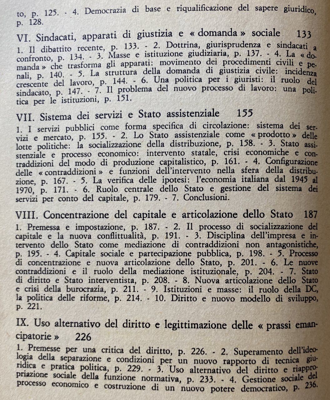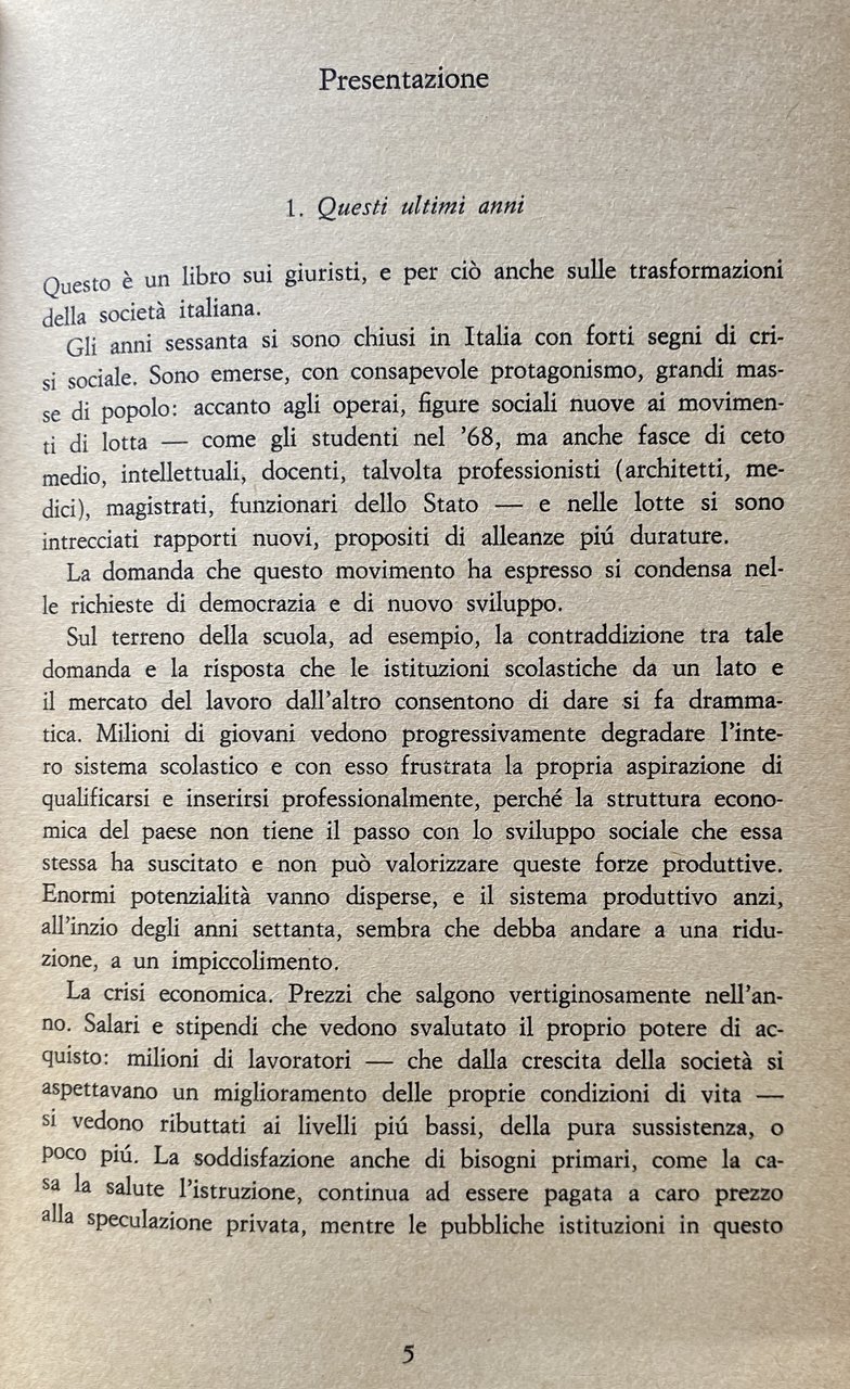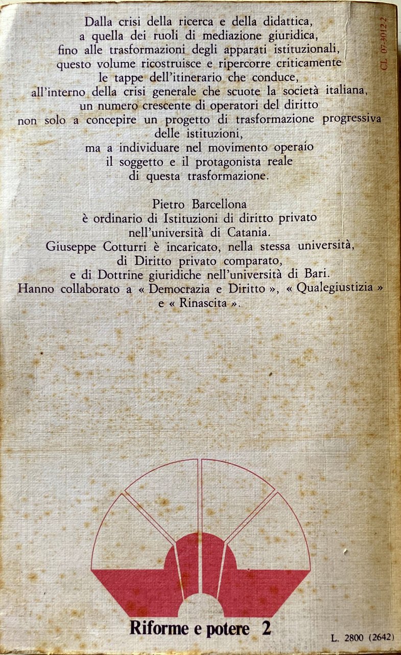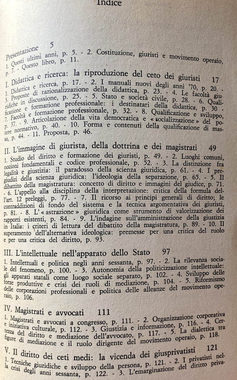 Soggetti: Diritto costituzionale, Ordinamento giuridico, Costituzione, Governo, Ideologie liberaldemocratiche, Liberaldemocrazia, Antifascismo, Separazione dei poteri, Rappresentanza, Contratto, Compromesso, Contraenti, Partiti politici, Organi, Soggetti politici, istituzioni, Studi giuridici, Giustizia amministrativa, Amministrazione, Italia, Giuristi, Anni Settanta, Saggi, Giurisprudenza, Stato, Magistratura, 1970-1973, Filosofia, Parlamento, Fascismo, Potere normativo, Diritto privato, Società civile, Movimento operaio Diritti sociali, Didattica, Ricerca, Manuali, Libri di testo, Codici, Facoltà giuridiche, Università, Formazione professionale, Avvocatura, Avvocati, Dottrina, Magistrati, Nozioni, Legalità, Legittimità, Scienze giuridiche, Dibattiti, Giudice, Critica, Interpretazione, Applicazione, Disciplina, Formule, Art. 12 preleggi, Principi, Contraddizioni, Astrazione, Norme, Apparati, Intellettuali, Autonomia, Anni Sessanta, Anni Settanta, Mediazione, Riformismo, Politica, Corporazioni, Privilegi, Alleanze, Informazione, Certezza, Dialettica, Ceto medio, Dirigenti, Sindacati, Sindacalismo, Giusprivatisti, Tecniche, Emarginazione, Democrazia, Assistenzialismo, Masse, Procedura, Procedimenti civili penali, Lavoro, Servizi, Mercato, Distribuzione, Interventismo, Economia, Capitalismo, Capitale, Concentrazione, Monopolio, Conflitti, Crisi, Burocrazia, Sviluppo, DC, Emancipazione, Tecnica giuridica, Bibliografia, Riferimento, Libri rari Vintage fuori catalogo, Dopoguerra, Interesse pubblico, Concertazione, Confindustria, Teoria, Umberto Cerroni, FIAT, Montedison, Gruppi, Claudio Napoleoni, Tecnocrazia, Consumatori, Associazioni, Difesa, Nicolò Lipari, Civilisti, Ortodossia, Ostracismo, Marxismo, Comunismo, Biagio De Giovanni, Luigi Mengoni, Giuseppe Vacca, Galvano della Volpe, Pietro Rescigno, Santoro Passarelli, Stefano Rodotà, Docenti, Studenti, Movimento studentesco, Operai, Togliatti, Costituente, Antonio Gramsci, Costantino Mortati, Paolo Barile, Paolo Berretta, Mario Libertini, Fabio Mazziotti, Luigi Volpe, Michele Giorgianni, Sessantotto, A. torrente, Sabino Cassese, Piero Craveri, Giovanni Battista Conso, Francesco Galgano, Giuseppe Federico Mancini, Umberto Romagnoli, Adolfo Di Majo, Giuffrè, Jovene, Andrea Torrente, Alberto Trabucchi, Norberto Bobbio, Legge Casati, Claudia Pecorella, Spadolini, L. Firpo, Franco Cordero, D. Riesman, F. Neumann, Giancarlo Mazzocchi, Sistema sociale, Partecipazioni statali, Aldo Schiavone, Hegel, Scuola storica, Emilio Betti, Pandettistica, Constitutional law, Legal system, Constitution, Government, Liberal democratic ideologies, Liberal democracy, Anti-fascism, Separation of powers, Representation, Contract, Compromise, Contractors, Political parties, Bodies, Political subjects, institutions, Legal studies, Administrative justice, Administration, Italy, Jurists , Seventies, Essays, Jurisprudence, State, Judiciary, Philosophy, Parliament, Fascism, Regulatory power, Private law, Civil society, Workers' movement, social rights, Teaching, Research, Manuals, Textbooks, Codes, Law faculties, University, Training professional, Advocacy, Lawyers, Doctrine, Magistrates, Notions, Legality, Legitimacy, Legal sciences, Debates, Judge, Criticism, Interpretation, Application, Discipline, Formulas, Pre-laws, Principles, Contradictions, Abstraction, Rules, Apparatuses, Intellectuals, Autonomy, Sixties, Seventies, Mediation, Reformism, Politics, Corporations, Privileges, Alliances, Information, Certainty, Dialectics, Middle class, Managers, Unions, Trade Unionism, Private Lawyers, Techniques, Marginalization, Democracy, Welfare, Masses, Procedure, Proceedings civil criminals, Work, Services, Market, Distribution, Interventionism, Economy, Capitalism, Capital, Concentration, Monopoly, Conflicts, Crisis, Bureaucracy, Development, Emancipation, Legal technique, Bibliography, Reference, Rare books out of print, Post-war period, Public interest, Concertation, Theory, Groups, Technocracy, Consumers, Associations, Defence, Civilists, Orthodoxy, Ostracism, Marxism, Communism, Teachers, Students, Student movement, Workers, Constituent, Social system, State participations, Historical school, Pandetics
