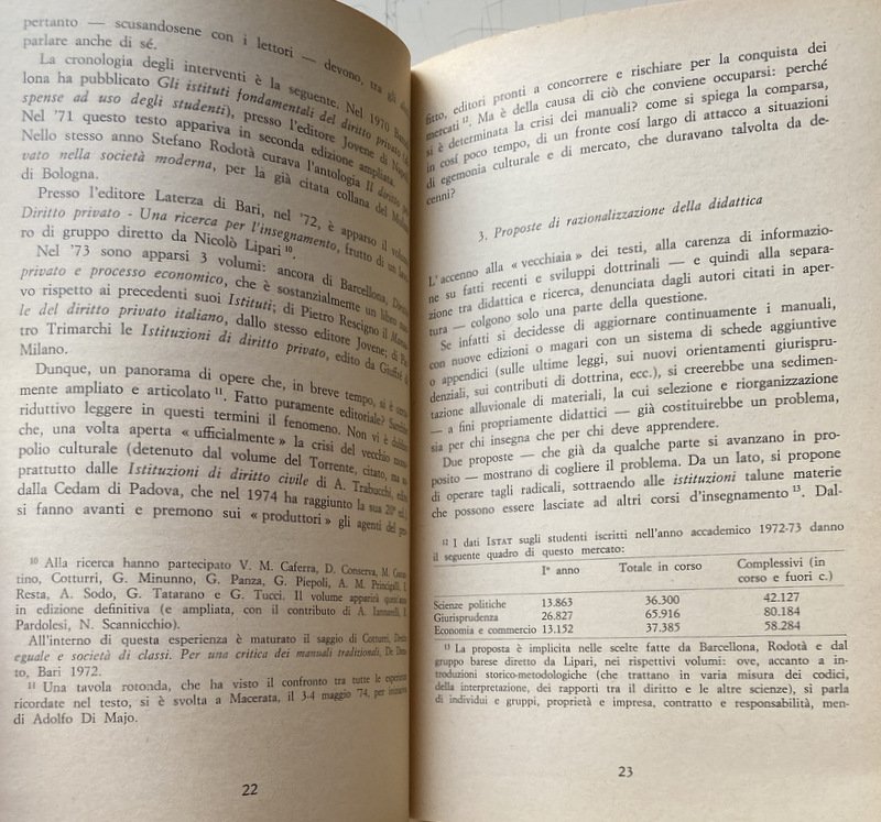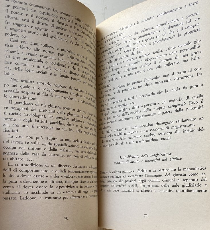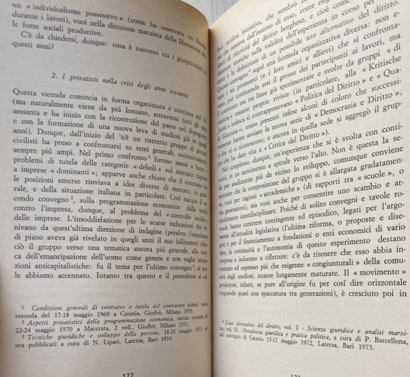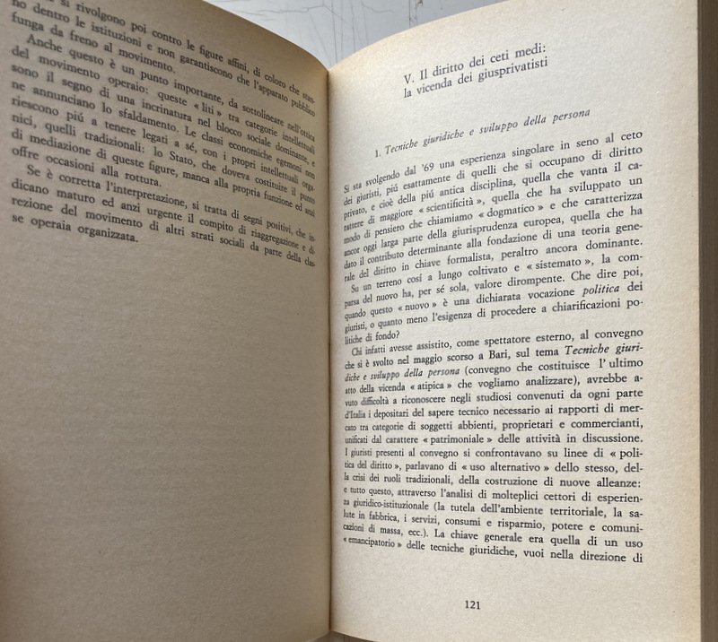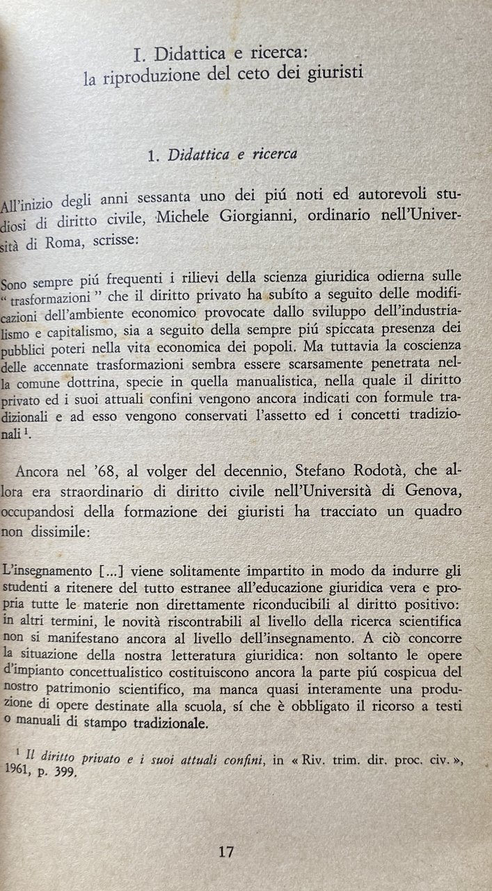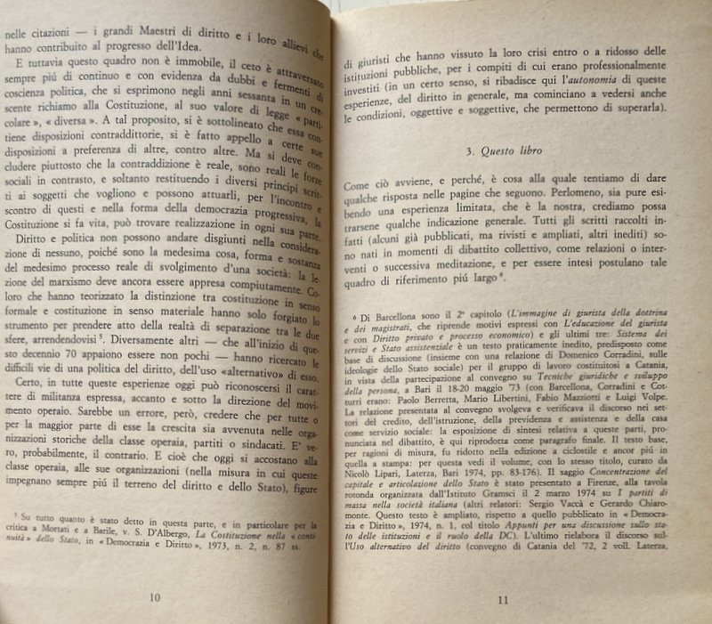 Soggetti: Diritto costituzionale, Ordinamento giuridico, Costituzione, Governo, Ideologie liberaldemocratiche, Liberaldemocrazia, Antifascismo, Separazione dei poteri, Rappresentanza, Contratto, Compromesso, Contraenti, Partiti politici, Organi, Soggetti politici, istituzioni, Studi giuridici, Giustizia amministrativa, Amministrazione, Italia, Giuristi, Anni Settanta, Saggi, Giurisprudenza, Stato, Magistratura, 1970-1973, Filosofia, Parlamento, Fascismo, Potere normativo, Diritto privato, Società civile, Movimento operaio Diritti sociali, Didattica, Ricerca, Manuali, Libri di testo, Codici, Facoltà giuridiche, Università, Formazione professionale, Avvocatura, Avvocati, Dottrina, Magistrati, Nozioni, Legalità, Legittimità, Scienze giuridiche, Dibattiti, Giudice, Critica, Interpretazione, Applicazione, Disciplina, Formule, Art. 12 preleggi, Principi, Contraddizioni, Astrazione, Norme, Apparati, Intellettuali, Autonomia, Anni Sessanta, Anni Settanta, Mediazione, Riformismo, Politica, Corporazioni, Privilegi, Alleanze, Informazione, Certezza, Dialettica, Ceto medio, Dirigenti, Sindacati, Sindacalismo, Giusprivatisti, Tecniche, Emarginazione, Democrazia, Assistenzialismo, Masse, Procedura, Procedimenti civili penali, Lavoro, Servizi, Mercato, Distribuzione, Interventismo, Economia, Capitalismo, Capitale, Concentrazione, Monopolio, Conflitti, Crisi, Burocrazia, Sviluppo, DC, Emancipazione, Tecnica giuridica, Bibliografia, Riferimento, Libri rari Vintage fuori catalogo, Dopoguerra, Interesse pubblico, Concertazione, Confindustria, Teoria, Umberto Cerroni, FIAT, Montedison, Gruppi, Claudio Napoleoni, Tecnocrazia, Consumatori, Associazioni, Difesa, Nicolò Lipari, Civilisti, Ortodossia, Ostracismo, Marxismo, Comunismo, Biagio De Giovanni, Luigi Mengoni, Giuseppe Vacca, Galvano della Volpe, Pietro Rescigno, Santoro Passarelli, Stefano Rodotà, Docenti, Studenti, Movimento studentesco, Operai, Togliatti, Costituente, Antonio Gramsci, Costantino Mortati, Paolo Barile, Paolo Berretta, Mario Libertini, Fabio Mazziotti, Luigi Volpe, Michele Giorgianni, Sessantotto, A. torrente, Sabino Cassese, Piero Craveri, Giovanni Battista Conso, Francesco Galgano, Giuseppe Federico Mancini, Umberto Romagnoli, Adolfo Di Majo, Giuffrè, Jovene, Andrea Torrente, Alberto Trabucchi, Norberto Bobbio, Legge Casati, Claudia Pecorella, Spadolini, L. Firpo, Franco Cordero, D. Riesman, F. Neumann, Giancarlo Mazzocchi, Sistema sociale, Partecipazioni statali, Aldo Schiavone, Hegel, Scuola storica, Emilio Betti, Pandettistica, Constitutional law, Legal system, Constitution, Government, Liberal democratic ideologies, Liberal democracy, Anti-fascism, Separation of powers, Representation, Contract, Compromise, Contractors, Political parties, Bodies, Political subjects, institutions, Legal studies, Administrative justice, Administration, Italy, Jurists , Seventies, Essays, Jurisprudence, State, Judiciary, Philosophy, Parliament, Fascism, Regulatory power, Private law, Civil society, Workers' movement, social rights, Teaching, Research, Manuals, Textbooks, Codes, Law faculties, University, Training professional, Advocacy, Lawyers, Doctrine, Magistrates, Notions, Legality, Legitimacy, Legal sciences, Debates, Judge, Criticism, Interpretation, Application, Discipline, Formulas, Pre-laws, Principles, Contradictions, Abstraction, Rules, Apparatuses, Intellectuals, Autonomy, Sixties, Seventies, Mediation, Reformism, Politics, Corporations, Privileges, Alliances, Information, Certainty, Dialectics, Middle class, Managers, Unions, Trade Unionism, Private Lawyers, Techniques, Marginalization, Democracy, Welfare, Masses, Procedure, Proceedings civil criminals, Work, Services, Market, Distribution, Interventionism, Economy, Capitalism, Capital, Concentration, Monopoly, Conflicts, Crisis, Bureaucracy, Development, Emancipation, Legal technique, Bibliography, Reference, Rare books out of print, Post-war period, Public interest, Concertation, Theory, Groups, Technocracy, Consumers, Associations, Defence, Civilists, Orthodoxy, Ostracism, Marxism, Communism, Teachers, Students, Student movement, Workers, Constituent, Social system, State participations, Historical school, Pandetics