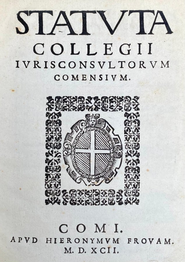 In-4° (cm. 19,8), legatura del XX secolo in mezza pergamena e piatti marmorizzati, pp. [16] in ottimo stato, non numerate, con stemma araldico in xilografia al frontespizio e antico elenco manoscritto dei componenti del Collegio dell'anno 1804 che segue quello a stampa del XVI secolo. Rara pubblicazione dei regolamenti dell'Ordine dei dottori in Legge di Como. Ottimo esemplare. (SH5)