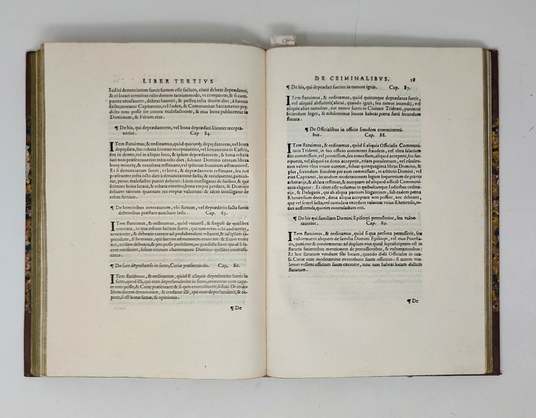 >3 opere in un vol. in-folio, bella legatura ottocentesca in m. marocchino marrone ed ang., tit. e fregi oro al dorso. - I) Liber primus Statutorum civilium, secundus Statutorum syndicorum, tertius Statutorum criminalium; ff. (4), 54; (4), 38; (4), 25, (1b.) e (26 di indice). Tre titoli identici per le tre parti recanti solo la scritta "Bernardus Dei gratia Episcopus Tridentinus etc.", grande stemma silogr. al centro con le armi del vescovo e della città con la scritta "unitas" e note tipogr. in basso. Ristampa dell'edizione impressa da Maffeo Fracacino nel 1528, sotto il vescovato di Bernardo Clasio, luogotenente del re Ferdinando di Ungheria e Boemia, presidente del Consiglio segreto e supremo cancelliere. - II) Forma costituendi census, in episcopatu tridentino et declaratio nonnullorum casuum, & contractuum illicitorum...; ff. (14). Sul tit. stemma silogr. del card. Madruzio. - III) Riforma, et regolatione nuova delle ferie, et vacanze annuali, che per l'avvenire s'haveranno da osservare nelle auditorij della città di Trento. Con nuove tasse, et moderationi delle mercedi...; ff. (10). Stemma silogr. del card. Madruzio sul tit. Curioso in fine un "editto contro gli danneggianti le campagne". - Importante e rarissimo assieme di statuti e disposizioni varie concernenti la città di Trento e valli limitrofe. Esemplare magnifico, dalla collezione di Giannalisa Feltrinelli (ex-libris al contropiatto). FONTANA III, 181 e MANZONI I, 493-4 (ambedue solo la I opera).