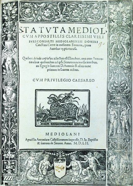 In-4 p. (mm. 305x210), 2 parti in 1 volume, pergamena mod., titolo oro su tassello al dorso, 78 cc.nn., 162 cc.num.; 2 cc.nn., 164 cc.num; bel frontespizio con vignetta, inquadrato in elaborata cornice figurata su fondo nero, inc. su legno. Nell'opera "Quibus deinde copiosus adiectus est Elenchus, una cum Annotationibus quibusdam ad ipsa Statuta maxime facientibus, ab Egregio Iurecon. D. Antonio Rubeo nunc primum in lucem editus". La seconda parte contiene i "Novissima Mediolani Statuta" e porta al fine: "Impensis D. Io. Baptistae, & Fratrum de Seronib, Anno MDL".Cfr. Fontana, p. 186 - Manzoni "Bibl. statutaria e storica italiana",I, p. 270 - Predari, p. 97 - Cat. Biblioteca Ambrogio Binda,1101: "Gli Statuti milanesi furono riuniti "a corpo unico" nel 1216, e pubblicati la prima volta il 20 dicembre 1480 da Pachel e Scinzenzeler". Alc. carte con lieve alone margin. e qualche traccia d'uso, nella prima parte. Nella seconda, solo ultime 30 cc. restaurate per ang. super. mancante, altrimenti fresco esemplare su carta forte, ben conservato.