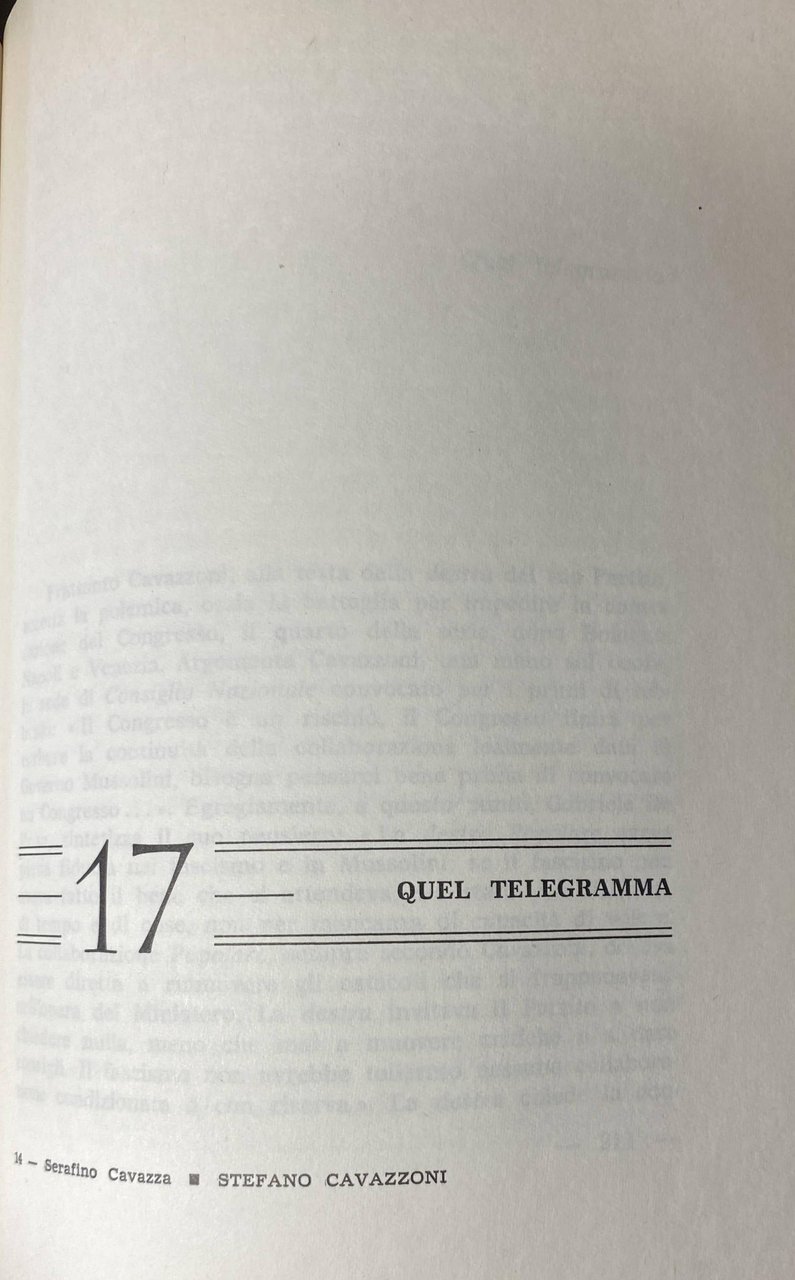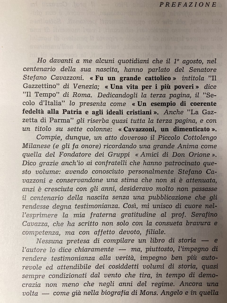 Ho davanti a me alcuni quotidiani che il 1 agosto, nel centenario della sua nascita, hanno parlato del Senatore Stefano Cavazzoni. Fu un grande cattolico intitola Il Gazzettino di Venezia; Una vita per i più poveri dice Il Tempo di Roma. Dedicandogli la terza pagina, il Secolo d'Italia lo presenta come Un esempio di coerente fedeltà alla Patria e agli ideali cristiani. Anche La Gazzetta di Parma gli riserba quasi tutta la terza pagina, e con un titolo su sette colonne: Cavazzoni, un dimenticato. Compie, dunque, un atto doveroso il Piccolo Cottolengo Milanese (e gli fa onore) ricordando una grande Anima come quella del Fondatore dei Gruppi Amici di Don Orione. Dico grazie anch'io ai confratelli che hanno patrocinato questo volume: avendo conosciuto personalmente Stefano Cavazzoni e conservandone una stima che non si è attenuata, anzi è cresciuta con gli anni, desideravo molto non passasse il centenario della nascita senza una pubblicazione che gli rendesse degna testimonianza. Così, mi unisco di cuore nell'esprimere la mia fraterna gratitudine al prof. Serafino Cavazza, che ha scritto non solo con la consueta bravura e competenza, ma con affetto devoto, filiale. Nessuna pretesa di compilare un libro di storia e l'autore lo dice chiaramente ma, piuttosto, l'impegno di rendere testimonianza alla verità, impegno ben più autorevole ed attendibile dei cosiddetti volumi di storia, quasi sempre condizionati dal vento che tira, in tempo di democrazia non meno che negli anni del regime.