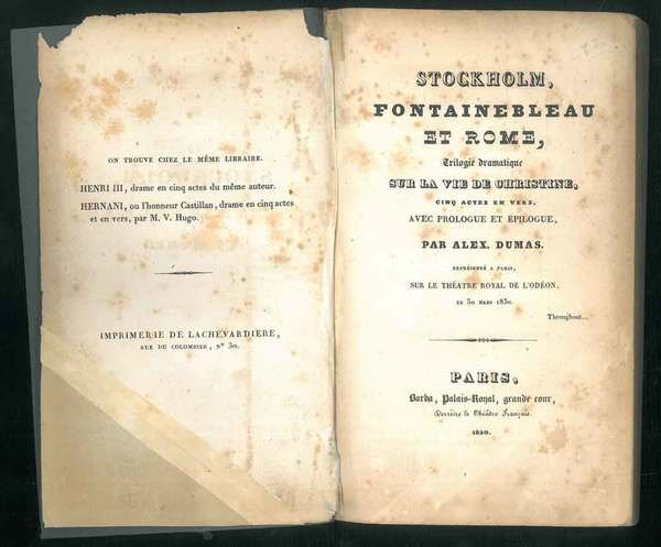 Stockholm, Fontainebleau et Rome, trilogie dramatique sur la vie de Christine. Cinq actes en vers, avec prologue et epilogue par Alex. Dumas. Représentée a Paris, sur le théatre Royal de l'Odéon le 30 mars 1830