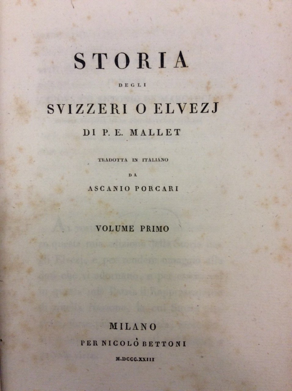 STORIA DEGLI SVIZZERI O ELVEZJ. - Tradotta in italiano da Ascanio Porcari.