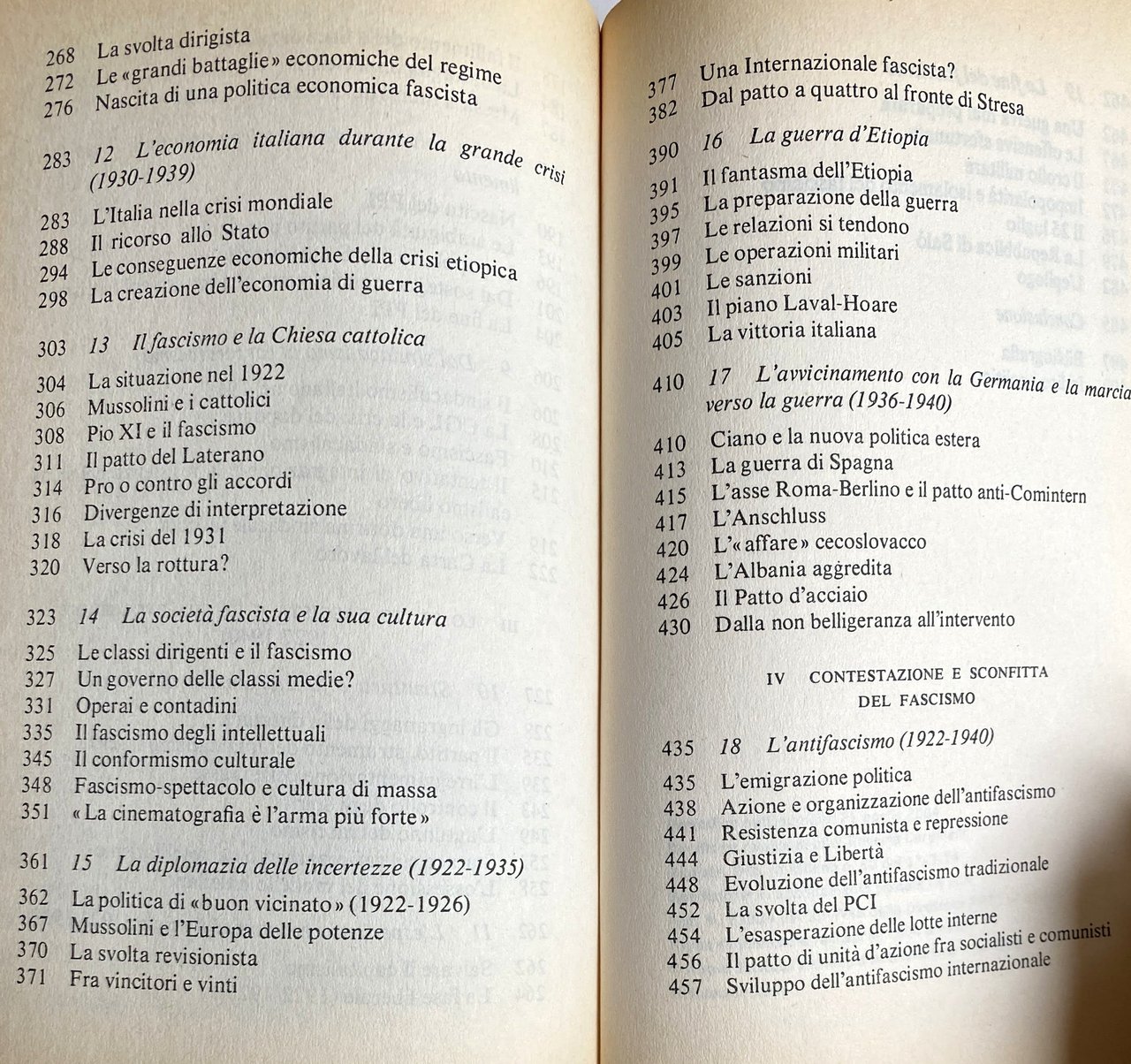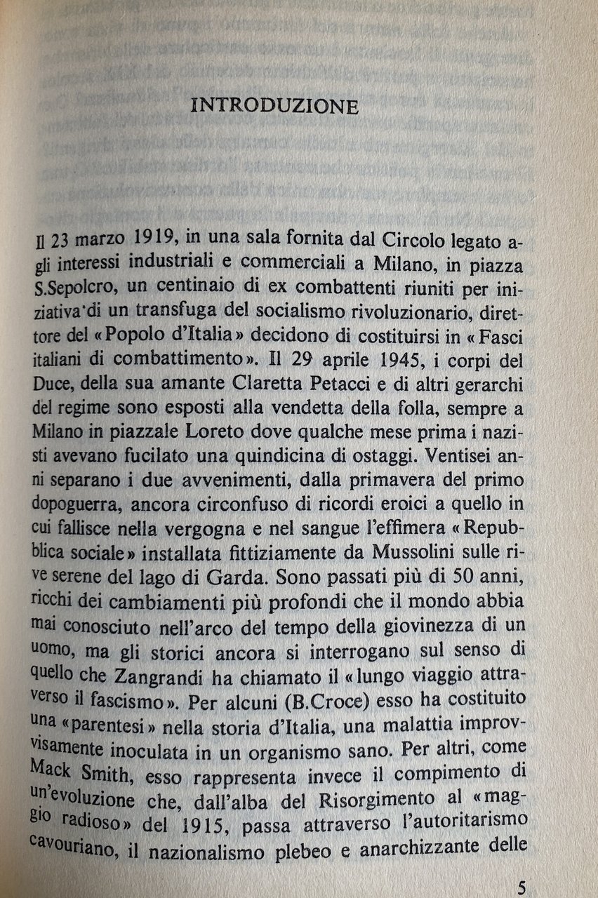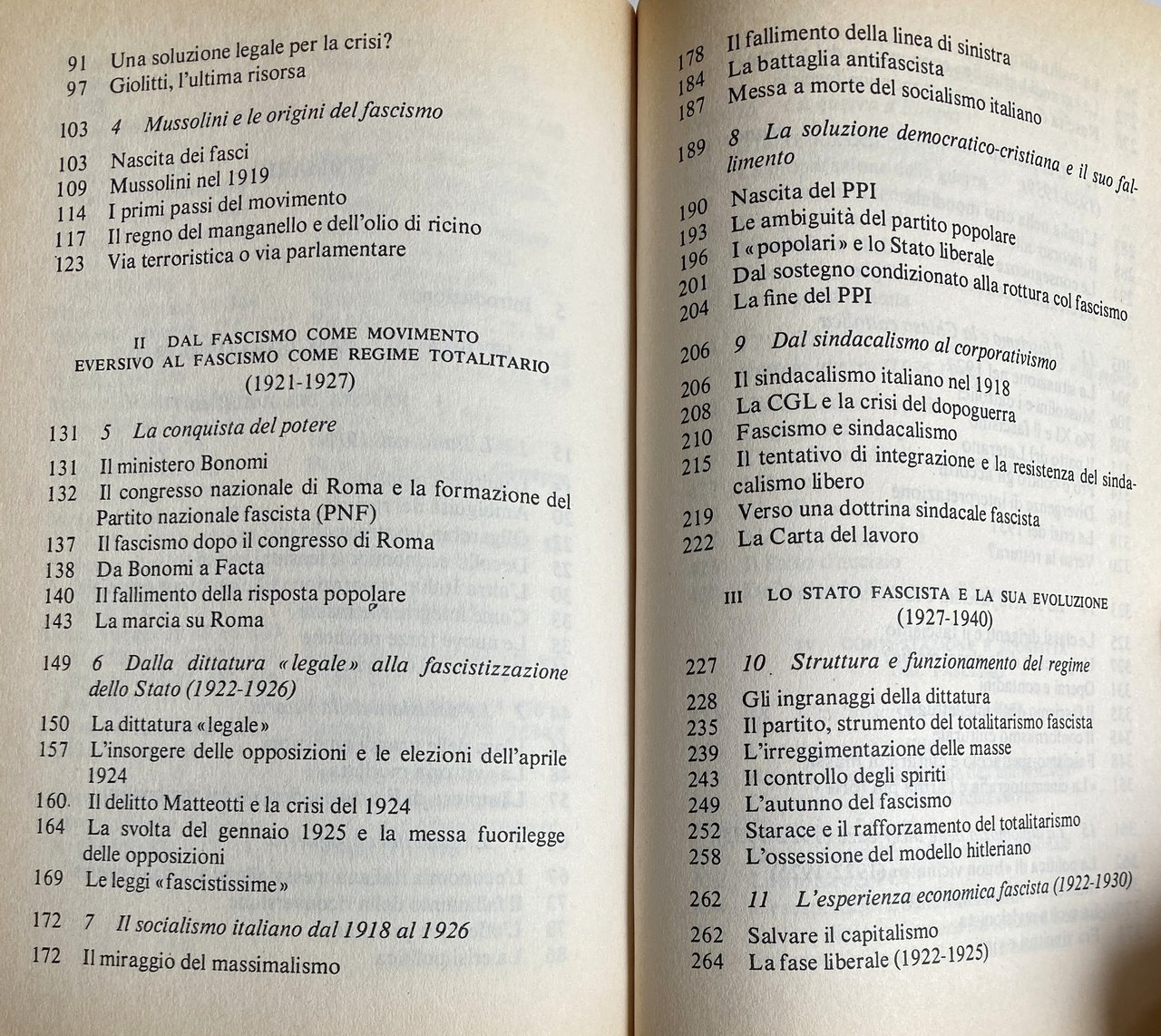 Soggetti: Storia contemporanea Fascismo Scienze politiche Studi politici Politologia Benito Mussolini Totalitarismo Dittatura Regime fascista Duce Nascita Genesi Italia 1918 Unità Ambiguità Oligarchia Potere Emigrazione Espansione coloniale Colonialismo Economia Masse Vittoria mutilata Impresa Fiume Declino Nazionalismo Società Consenso Dissenso Intellettuali Crisi Dopoguerra Nazismo Guerra Riconversione Proletariato Marxismo Comunismo Socialismo Impopolarità Isolamento 25 luglio Repubblica di Salò Bibliografia Riferimento Saggi Libri fuori catalogo Giolitti Origini Fasci 1919 Manganello Olio di ricino Violenza Repressione Parlamento Aventino Delitto Matteotti Eversione Conquista Bonomi Congresso nazionale Marcia Roma PNF Facta Fascistizzazione Stato 1922 Opposizioni Elezioni 1924 Svolta Leggi fascistissime Massimalismo Sinistra Lotta antifascista Democrazia cristiana Clero PPI Popolare Liberalismo Sindacalismo Corporativismo Corporazioni Sindacati CGL Resistenza Dottrina sindacale Carta del lavoro Struttura Amministrazione Irreggimentazione Controllo Starace Hitler Capitalismo Fase liberale Etiopia Chiesa cattolica Cattolici Pio XI Patti Lateranensi Cultura Classi dirigenti Classe media Operai Contadini Conformismo culturale Spettacolo Massa Cinematografia Diplomazia Europa Potenze Revisionismo Critica Interpretazione Stresa Eritrea Abissinia Libia Africa Albania Operazioni militari Sanzioni Laval-Hoare Germania Galeazzo Ciano Politica estera economica Spagna Franchismo Franco Anni Trenta Asse Roma-Berlino Comintern Unione Sovietica Russia Stati Uniti Inghilterra Winston Churchill Carteggio Lettere Anschluss Antisemitismo Deportazioni Ebrei Cecoslovacchia Patto d'acciaio Non belligeranza Interventisti Sconfitta Partigiani Armistizio Antifascismo Giustizia Libertà PCI Partito Comunista Comunisti Manifesto Socialisti Internazionale Fuga Piazzale Loreto Claretta Petacci Zangrandi Benedetto Croce Mack Smith Renzo De Felice Borghesia Ideologie MSI Futurismo Arte Futuristi Cinecittà Neorealismo Maffeo Pantaleoni Salvatore La Francesca Autoritarismo Alleati Bombardamenti Badoglio X Mas FIAT Scioperi Camicie nere Franzinelli Vannoni Villari Ansaldo Gentile Bottai Galasso Acerbo Luigi Albertini Italo Balbo De Bono De Gasperi Dumini Farinacci Dino Grandi Antonio Gramsci Piero Gobetto Negus Arturo Carlo Jemolo Graziani Goring Himmler Emilio Lussu Levi Luzzatti Tommaso Marinetti Modigliani Lenin Savoia Monaco Nitti Pavolini Papini Parri Cesare Pavese Pirandello Ribbentrop Alfredo Rocco Rivoluzione Rosselli Roosevelt Salandra Serrati Sturzo Stalin Sidney Sonnino Ardengo Soffici Ignazio Silone Salvatorelli Salvemini Margherita Sarfatti Angelo Tasca Palmiro Togliatti Treves Filippo Turati Gioacchino Volpe Vittorio Emanuele Zavattini Lloyd George Massoneria Divulgazione storica Ventennio Presse L'Action française Stampa Editoria Journaux fascistes Pierre Laval Léon Blum Gustave Hervé Daudet Führer Petite-Bourgeoisie Imperialismo Confindustria Squadrismo Squadristi Laterza Corriere della Sera Contemporary history Fascism Political sciences Studies Totalitarianism Dictatorship Fascist Birth Genesis Italy Unity Ambiguity Oligarchy Power Emigration Colonial expansion Colonialism Economy Masses Mutilated victory Decline Nationalism Society Consensus Dissent Intellectuals Crisis Postwar Nazism War Reconversion Proletariat Marxism Communism Socialism Unpopularity Isolation Republic Bibliography Reference Essays Out of print books Origins Truncheon Castor oil Violence Repression Parliament Crime Subversion Conquest National Congress March Rome Fascistization State Opposition Elections Turning point Laws Maximalism Left Anti-fascist struggle Christian democracy Clergy Popular Liberalism Syndicalism Corporatism Corporations Resistance Trade unions doctrine Labor charter Structure Administration Regimentation Control Capitalism Ethiopia Catholic Church Catholics Pius Lateran Pacts Culture Ruling classes Middle class Workers Peasants Cultural conformism Entertainment Mass Cinematography Diplomacy Europe Powers Revisionism Criticism Interpretation Abyssinia Libya Military operations Sanctions Germany Foreign economic policy Spain Rome-Berlin Axis Soviet United States England Correspondence Letters Anti-Semitism Deportations Jews Czechoslovakia Pact Steel Non-belligerence Interventionists Defeat Partisans Armistice Anti-fascism Justice Freedom Communist Party Communists Socialists International Escape Petty Bourgeoisie Ideologies Futurism Futurists Authoritarianism Allies Bombings Strikes Blackshirts Savoy Munich Freemasonry Historical dissemination Twenty years Press Publishing Imperialism Squadismo Squadrists