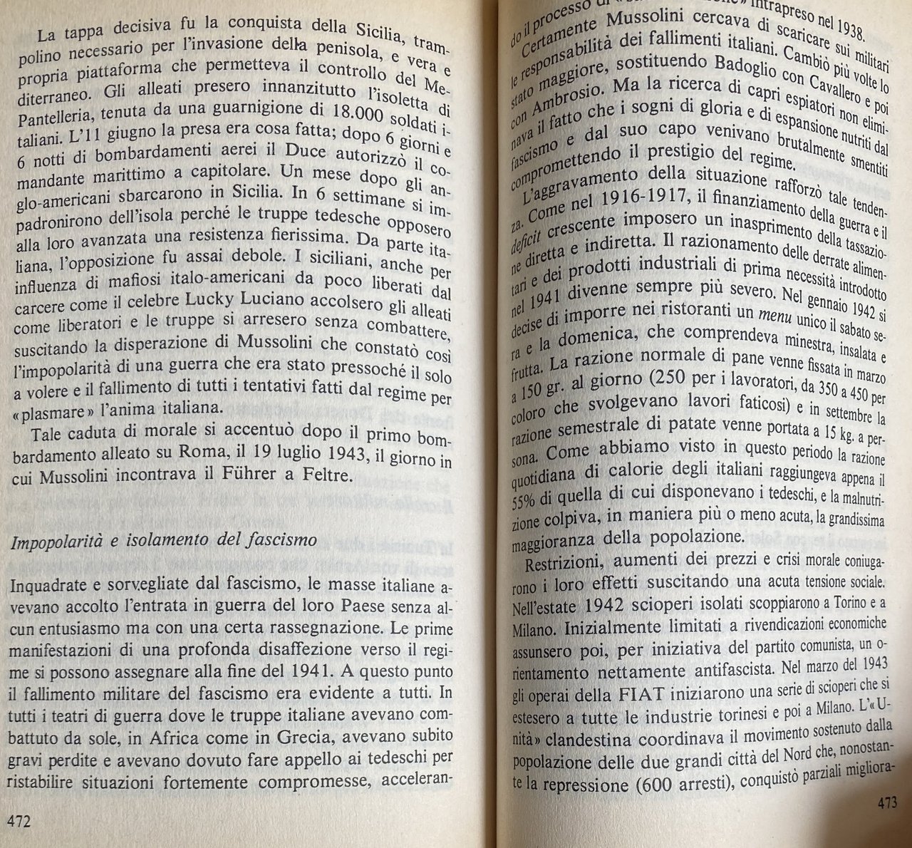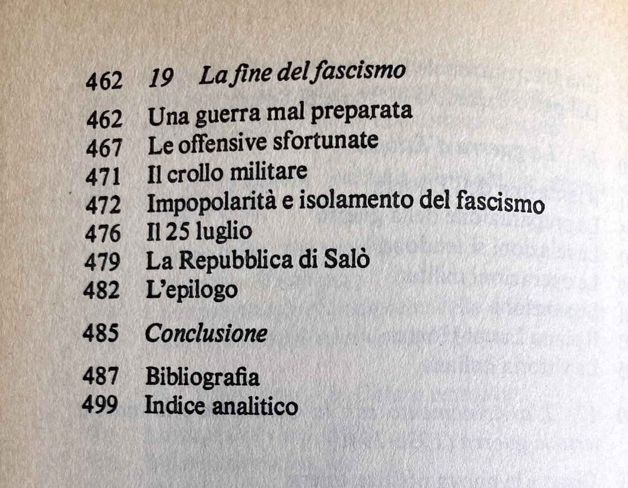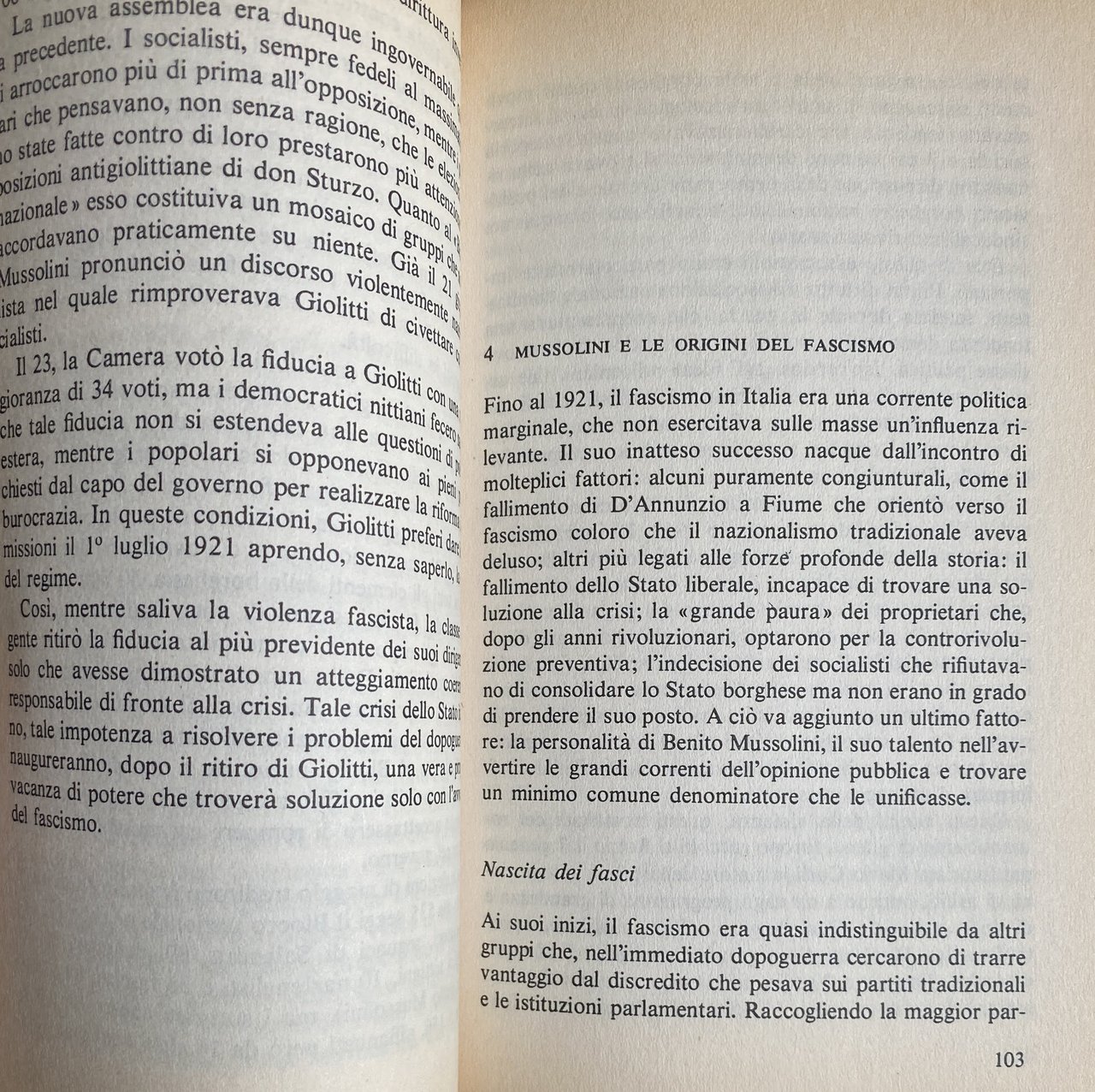 Soggetti: Storia contemporanea Fascismo Scienze politiche Studi politici Politologia Benito Mussolini Totalitarismo Dittatura Regime fascista Duce Nascita Genesi Italia 1918 Unità Ambiguità Oligarchia Potere Emigrazione Espansione coloniale Colonialismo Economia Masse Vittoria mutilata Impresa Fiume Declino Nazionalismo Società Consenso Dissenso Intellettuali Crisi Dopoguerra Nazismo Guerra Riconversione Proletariato Marxismo Comunismo Socialismo Impopolarità Isolamento 25 luglio Repubblica di Salò Bibliografia Riferimento Saggi Libri fuori catalogo Giolitti Origini Fasci 1919 Manganello Olio di ricino Violenza Repressione Parlamento Aventino Delitto Matteotti Eversione Conquista Bonomi Congresso nazionale Marcia Roma PNF Facta Fascistizzazione Stato 1922 Opposizioni Elezioni 1924 Svolta Leggi fascistissime Massimalismo Sinistra Lotta antifascista Democrazia cristiana Clero PPI Popolare Liberalismo Sindacalismo Corporativismo Corporazioni Sindacati CGL Resistenza Dottrina sindacale Carta del lavoro Struttura Amministrazione Irreggimentazione Controllo Starace Hitler Capitalismo Fase liberale Etiopia Chiesa cattolica Cattolici Pio XI Patti Lateranensi Cultura Classi dirigenti Classe media Operai Contadini Conformismo culturale Spettacolo Massa Cinematografia Diplomazia Europa Potenze Revisionismo Critica Interpretazione Stresa Eritrea Abissinia Libia Africa Albania Operazioni militari Sanzioni Laval-Hoare Germania Galeazzo Ciano Politica estera economica Spagna Franchismo Franco Anni Trenta Asse Roma-Berlino Comintern Unione Sovietica Russia Stati Uniti Inghilterra Winston Churchill Carteggio Lettere Anschluss Antisemitismo Deportazioni Ebrei Cecoslovacchia Patto d'acciaio Non belligeranza Interventisti Sconfitta Partigiani Armistizio Antifascismo Giustizia Libertà PCI Partito Comunista Comunisti Manifesto Socialisti Internazionale Fuga Piazzale Loreto Claretta Petacci Zangrandi Benedetto Croce Mack Smith Renzo De Felice Borghesia Ideologie MSI Futurismo Arte Futuristi Cinecittà Neorealismo Maffeo Pantaleoni Salvatore La Francesca Autoritarismo Alleati Bombardamenti Badoglio X Mas FIAT Scioperi Camicie nere Franzinelli Vannoni Villari Ansaldo Gentile Bottai Galasso Acerbo Luigi Albertini Italo Balbo De Bono De Gasperi Dumini Farinacci Dino Grandi Antonio Gramsci Piero Gobetto Negus Arturo Carlo Jemolo Graziani Goring Himmler Emilio Lussu Levi Luzzatti Tommaso Marinetti Modigliani Lenin Savoia Monaco Nitti Pavolini Papini Parri Cesare Pavese Pirandello Ribbentrop Alfredo Rocco Rivoluzione Rosselli Roosevelt Salandra Serrati Sturzo Stalin Sidney Sonnino Ardengo Soffici Ignazio Silone Salvatorelli Salvemini Margherita Sarfatti Angelo Tasca Palmiro Togliatti Treves Filippo Turati Gioacchino Volpe Vittorio Emanuele Zavattini Lloyd George Massoneria Divulgazione storica Ventennio Presse L'Action française Stampa Editoria Journaux fascistes Pierre Laval Léon Blum Gustave Hervé Daudet Führer Petite-Bourgeoisie Imperialismo Confindustria Squadrismo Squadristi Laterza Corriere della Sera Contemporary history Fascism Political sciences Studies Totalitarianism Dictatorship Fascist Birth Genesis Italy Unity Ambiguity Oligarchy Power Emigration Colonial expansion Colonialism Economy Masses Mutilated victory Decline Nationalism Society Consensus Dissent Intellectuals Crisis Postwar Nazism War Reconversion Proletariat Marxism Communism Socialism Unpopularity Isolation Republic Bibliography Reference Essays Out of print books Origins Truncheon Castor oil Violence Repression Parliament Crime Subversion Conquest National Congress March Rome Fascistization State Opposition Elections Turning point Laws Maximalism Left Anti-fascist struggle Christian democracy Clergy Popular Liberalism Syndicalism Corporatism Corporations Resistance Trade unions doctrine Labor charter Structure Administration Regimentation Control Capitalism Ethiopia Catholic Church Catholics Pius Lateran Pacts Culture Ruling classes Middle class Workers Peasants Cultural conformism Entertainment Mass Cinematography Diplomacy Europe Powers Revisionism Criticism Interpretation Abyssinia Libya Military operations Sanctions Germany Foreign economic policy Spain Rome-Berlin Axis Soviet United States England Correspondence Letters Anti-Semitism Deportations Jews Czechoslovakia Pact Steel Non-belligerence Interventionists Defeat Partisans Armistice Anti-fascism Justice Freedom Communist Party Communists Socialists International Escape Petty Bourgeoisie Ideologies Futurism Futurists Authoritarianism Allies Bombings Strikes Blackshirts Savoy Munich Freemasonry Historical dissemination Twenty years Press Publishing Imperialism Squadismo Squadrists