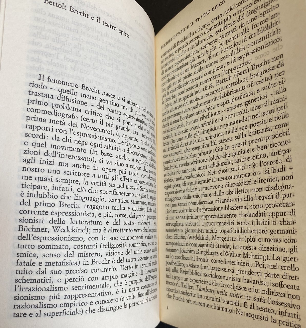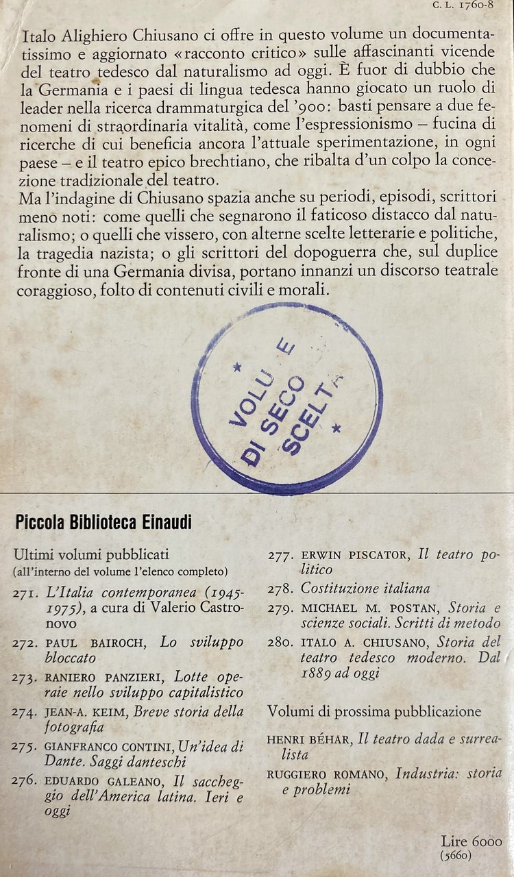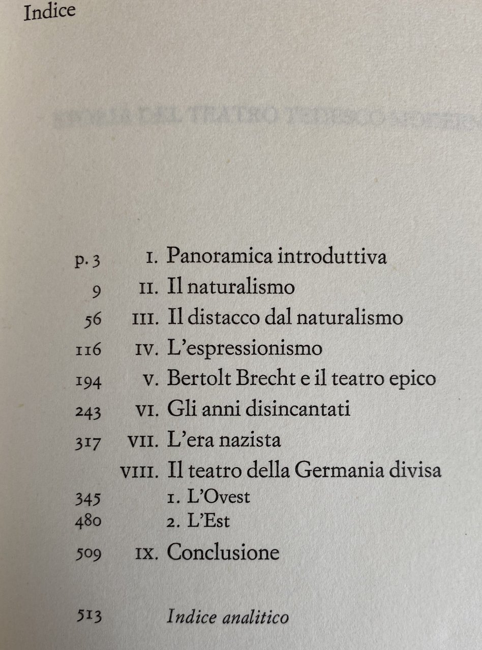 Soggetti: Critica letteraria teatrale Letteratura tedesca Germania Teatro Drammaturgia Bertold Brecht Storia culturale Naturalismo Espressionismo Nazismo Opere Testi teatrali Ovest Est Cultura Benjamin Bauhaus Kafka Nietzsche Adorno Goethe Biedermeier Bibliografia Riferimento Collezionismo Libri rai fuori catalogo Ambiente Amore Artisti Attori Berliner Ensemble Berlino Borghese Borghesia Spettacolo Brahm Commedia Conflitto Dialogo Donna Erwin Piscator Espressionista Friedrich Wolf Grand guignol Grottesco Guerra Hacks Handke Hauptmann Helene Weigel Hitler Hofmannsthal Georg Kaiser Kroetz Kurt Weill Lavoro Lingua Linguaggio Lirica Lotta Madre Max Reinhardt Modernismo Moglie Mondo Morte Musica Nazista Neue Sachlichkeit Padre Personaggi Poesia Poetica Politica Protagonista Psicologica Pubblico Rappresentazione Realismo Realtà Regia Registi Religioso Ribalta Rivoluzione Romanzo Satira Scena Scenica Schnitzler Sionismo Sociale Ebraismo Ebrei Sposa Sternheim Stile Successi Suicidio Assurdo Epico Epica Theater Thomas Mann Tragedia Versi Visione Wedekind Anarchie im Drama August Stramm BABLET Bettler Bronnen Correnti Dadaismo Däubler Diebold Drammatica Emsdetten Ernst Toller Expressionismus Fuchs Goering Gusto Herwarth Walden Hinkemann Hoffnung Frauen Ideale Jessner Kokoschka Lothar Schreyer MAZZUCCHETTI Messinscena Metafisica Mistica Mörder OHIO Pandolfi Polemica Ritmo Sievert Simboli Sionista Sohn Staatstheater Strindberg Struttura Sturm und Drang Tage der Menschheit Tecnica Novecento Théâtre Tragico Unruh Vatermord VINCENTI Volksbühne Walter Hasenclever Werfel Werner Romanticismo Agit-prop Karl Krauss Alfred Kerr Amante Delirio Deutsches Holz Lulú Macabro Neoromantici Paul Wegener Pittore Spirito Sudermann Monaco Drammi Repubblica di Weimar Media Finanziamento Propaganda Corale Mmistero medioevale Gesuiti Controriforma Wagner Teatralità Adunanze Piazza Fiaccolate Raduni Celebrazione Partito Heiner Müller Potere Postmoderno Sperimentazioni Bernhard Elfriede Jelinek Fassbinder Dürrenmatt Richard Strauss Opera da tre soldi Vita di Galileo Madre Coraggio e i suoi figli Achternbusch Allestimenti Austria Besucher Beutler Botho Strauß Burgtheater Claus Peymann Commedie contemporaneo Eugenio Bernardi Fleißer Franco Quadri Frankfurt Franz Xaver Gazzerro Righi Hanser Verlag Interpreti Kaspar Literatur Menin Minetti München Narrativa Nora Pièce Recensioni Recitazione Reinbek Ricezione Rowohlt Schweiz Sipario Sperr Stück Suhrkamp Svizzera Elfo Stabile Theaterstücke Umberto Gandini Widmer Zeitung Zürich