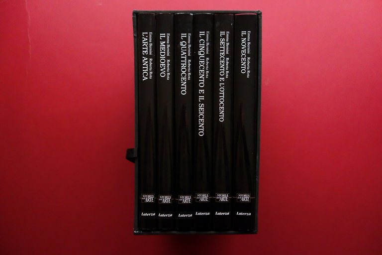Bernini Emma - Rota Roberta, Storia dell'Arte - L'arte antica - - Il Medioevo - - Il Quattrocento - - Il Cinquecento e il Seicento - - Il Settecento e l'Ottocento - - Il Novecento - Editori Laterza, Roma - Bari, 2000-2002; 33,5x24,5 cm., 6 voll. completo, oltre 2000 pp. con moltissime ill. a colori n. t. e a p. pag., tutta tela con titoli oro anche ai dorsi, sovracoperte ill. a colori con bandelle, cofanetto in tutta tela muto. Condizioni di conservazione. Volumi tutti complessivamente molto ben conservati con minime tracce di utilizzo. Cofanetto ed. complessivamente in buono stato con tracce di sporco, alcuni marginali difetti e sgualciture, un margine con strappetto al rivestimento telato e fessurazione di alcuni cm, esemplare compatto. SETT59.L4887 N-ST3