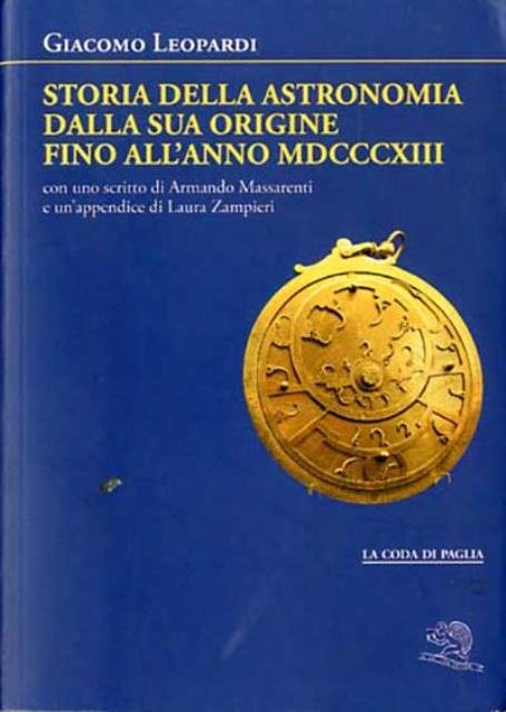 459 p. ; 17 x 12 cm. La coda di paglia, 23. "La più sublime, la più nobile tra le Fisiche scienze ella è senza dubbio l'Astronomia. L'uomo s'innalza per mezzo di essa come al di sopra di se medesimo, e giunge a conoscere la causa dei fenomeni più straordinari. Una così utile scienza dopo essere stata per molto tempo soggetta alle tenebre dell'errore ed alle follie degli antichi filosofi, venne finalmente ne' posteriori secoli illustrata a segno, che meritamente può dirsi, poche esser quelle scienze, che ad un tal grado di perfezione sieno ancor giunte. L'uomo può certamente vantarsi di aver superati i maggiori ostacoli, che la natura oppor potesse al prepotente suo ingegno, e d'esser quasi giunto all'apice della sapienza. Gli uomini han fatto mai sempre grande stima della scienza degli astri." Esordisce così Giacomo Leopardi in questa opera giovanile dalla quale riceverà riconoscimenti che salgono ben presto a un grado di ammirazione e che esaltano la eccezionale importanza del filologo. Con uno scritto di Armando Massarenti e un'appendice di Laura Zampieri. Brossura editoriale, coperta in cartoncino flessibile con bandelle illustrata a colori con impresso il titolo al piatto e al dorso. Codice libreria 7960.