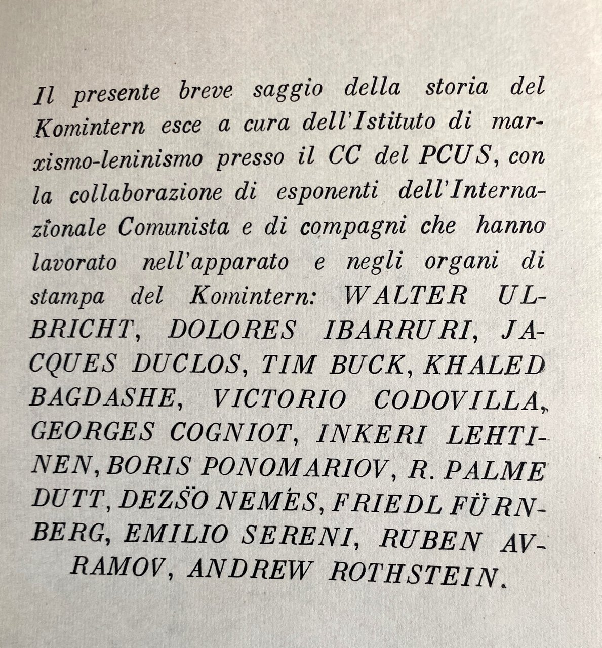 Il presente breve saggio della storia del Komintern esce a cura dell'Istituto di marxismo-leninismo presso il CC del PCUS, con la collaborazione di esponenti dell'Internazionale Comunista e di compagni che hanno lavorato nell'apparato e negli organi di stampa del Komintern: WALTER ULBRICHT, DOLORES IBARRURI, JACQUES DUCLOS, TIM BUCK, KHALED BAGDASHE, VICTORIO CODOVILLA, GEORGES COGNIOT, INKERI LEHTINENEN, BORIS PONOMARIOV, R. PALME DUTT, DEZŠO NEMES, FRIEDL FÜRNBERG, EMILIO SERENI, RUBEN AVRAMOV, ANDREW ROTHSTEIN.