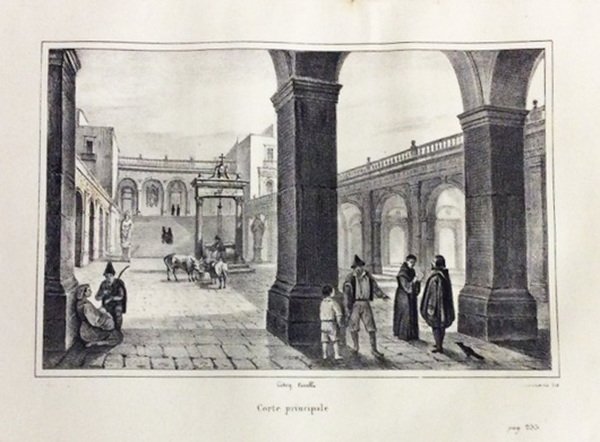In-8 gr., 3 volumi., brossura, pp. (6),XIII,(3),428; (6),322; (6),384; con 3 deliziose vedutine litografate a ciasc. frontespizio; grande testata e pregevole iniziale ornata, all'inizio di ogni volume; varie riproduz. nel testo di sigilli e medaglie, e con 22 belle tavole complessive fuori testo, incluse le antiporte. Tutta la parte illustrativa, disegnata da Francesco Molino, è litografata da G. Mariani, G. Riccio, lo stesso Molino, etc. Storia della Badia, sede principale dell'Ordine di S. Benedetto "dall'anno di sua fondazione fino ai giorni nostri". "Prima edizione". Cfr. Fera / Morlicchio "Regno di Napoli e delle Due Sicilie",II, p. 328-29: "Rarissima opera ottocentesca" - Lozzi,I,2900 (in Nota): "Opera pregevolissima e rara". Mancano 8 cc. (da p. 129 a 144) nel primo volume, qui riprodotte su carta antica, solo qualche lieve fioritura, altrimenti esemplare con barbe, ben conservato.