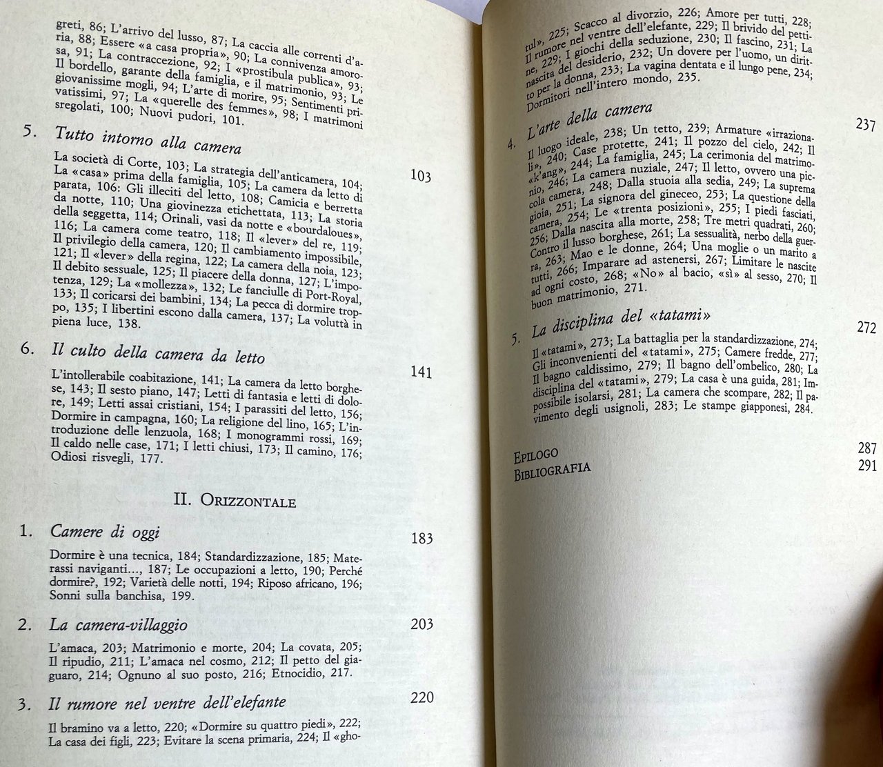 Soggetti: Etnologia Sociologia Dormire Camera da letto Cultura Mitologia Storia Usi e costumi Società Tradizioni Antichi Greci Divinità Hipnos Sonno Eros Afrodite Limbo Transfert Sogno Privacy Civiltà umana Neanderthal Grotta Gineceo assiro-babilonese Cubiculum Romani Casa Letti collettivi Moralità Paganesimo Umiliazione carnale Alcove rinascimentali Gusto Eleganza Ottocento borghese Borghesia Mobili Suppellettili Lusso privato Potere pubblico Matrimonio Usanze Eccentricità Luogo sacro Luoghi Famiglia Amanti Pratiche Consuetudini erotiche Tipi Sofà Talamo Tatami giapponese Viaggio Caverna Ossa Mammut Cacciatori Pincevent Riscaldamento Illuminazione Sessualità Risveglio Morte Urbanizzazione Mesopotamia Arredamento Moda Egizi Hetepheres Zanzariere Stanze da bagno Effusioni Horus Salomone Arredi Nuovo Testamento Eterno Insonne Intimità Aristofane Educazione Ulisse Elucubrazioni Camere separate Dèi Domestica Coniugale Promiscuità Mastio Camerario Ciambellani Pozioni magiche Uguaglianza Jus primae noctis Chemise Sala Scala Vocabolario Nudi Vita onirica Donna Gesti intimi Sguardi Sentimenti Spazio Superfluo Convivenza Contraccezione Prostibula Bordello Mogli Querelle des femmes Corte Cortigiani Reali Regine Anticamera Camicia Berretta Seggetta Orinali Vasi da notte Bourdaloues Lever Re Privilegio Noia Piacere Impotenza Mollezza Port-Royal Bambini Libertini Culto Coabitazione Sesto piano Parassiti Campagna Lino Lenzuola Monogrammi rossi Caldo nelle case Camino Focolare domestico Donne Tecnica Standardizzazione Materassi Riposo africano Amaca Covata Ripudi Etnocidio Elefante Ghotul Divorzio Amore Rumore Giochi Seduzione Fascino Desiderio Vagina Pene Dormitori Simbolismo Arte Kang Cerimonie Nuziale Stuoia Sedia Posizioni Kamasutra Piedi fasciati Nascita Metri quadrati Mao Mariti Disciplina Pavimento Stampe Bibliografia Riferimento Collezionismo Saggistica Libri rari illustrati fuori catalogo Scienze sociali Studi culturali Pigrizia Villaggi Amazzonia India Romanticismo Dolore K'ang cinese Pisolino Soffitte Bad ohne Zimmer Michelle Perrot Aneddotica Spazi personali Architettura Design Diari privati Romanzi Memorie Corrispondenza Malattia Alberghi Ospitalità Albertine Alice James Appartamento Armadio Monolocale Chambre Decorazioni Sogni Émile Zola Francia François Mauriac Gallimard George Sand Ragazze Henri Michaux Honoré de Balzac Ospedale Hôtel Albergo Igiene Immagini Interni Jean king Pléiade Alloggi Madame de Maintenon Maison Marcel Proust Mario Praz Oblomov Dipinti Palazzo Prigione Saint-Simon Seuil Condivisione Simone de Beauvoir Solitudine Versailles Carta da parati Muri Finestra Insonnia Attilio Bertolucci Tao Castello Baldacchino Gemelli Tappezzeria Rouche Tristano Isotta Carcopino Duby Bloch Febvre Aries Pirenne Flandrin de Maistre Burgess Propp Diderot Deffontaines Leiris Lit Meunier Kristeva Ethnology Sociology Sleep Bedroom Culture Mythology History Customs Traditions Society Ancient Greeks Deities Aphrodite Dreams Cave Gynaeceum Romans Houses Collective beds Morality Paganism Carnal humiliation Renaissance alcoves Taste Elegance Nineteenth century Bourgeoisie Furniture Furnishings Private luxury Public power Marriage Eccentricity Sacred place Places Family Lovers Practices Erotics Types Japanese thalamus Travelling Voyage Bones Mammoth Hunters Heating Lighting Sexuality Awakening Death Urbanization Furnishing Fashion Egyptians Mosquito nets Bathrooms Effusions New Testament Sleepless Intimacy Aristophanes Education Ulysses Lucubrations Rooms Gods Maid Conjugal Promiscuity Keep Chamberlains Potions magic Equality Hall Staircase Vocabulary Nudes Woman Intimate gestures Looks Feelings Space Superfluous Cohabitation Contraception Prostibule Brothel Wives Court Courtiers Royals Queens Antechamber Shirt Cap Chair Urinals Chamber pots Privilege Boredom Pleasure Impotence Softness Children Libertines Cult Sixth floor Parasites Countryside Linen Sheets Red monograms Warmth in the houses Fireplace Domestic hearth Women Technology Standardization Mattresses African rest Hammock Brood Repudiations Ethnocide Elephant Divorce Love Noise Games Seduction Fascination Desire Penis Dormitories Symbolism Ceremonies Wedding Mat Positions Bound feet Birth Square meters Husbands Discipline Bibliography Reference Collecting Non-fiction Rare illustrated books out of print Social sciences Cultural studies Laziness Villages Amazon Romanticism Chinese pain Nap Attics Anecdotes Personal spaces Architecture Diaries Novels Memories Correspondence Illness Hotels Hospitality Apartment Closet Studio Room Decorations Dreams France Girls Hospital Hotel Hygiene Images Interiors Accommodations Paintings Palace Prison Sharing Solitude Wallpaper Walls Window Insomnia Castle Canopy Twins Tapestry Tristan Isolde