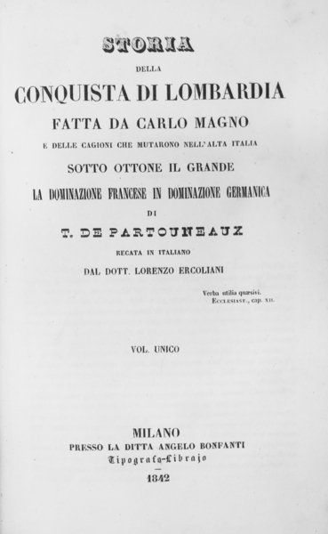 STORIA DELLA CONQUISTA DI LOMBARDIA FATTA DA CARLO MAGNO. - E delle cagioni che mutarono nell'Alta Italia, sotto Ottone il Grande, la dominazione francese in dominazione germanica. Recata in italiano da Lorenzo Ercolani.