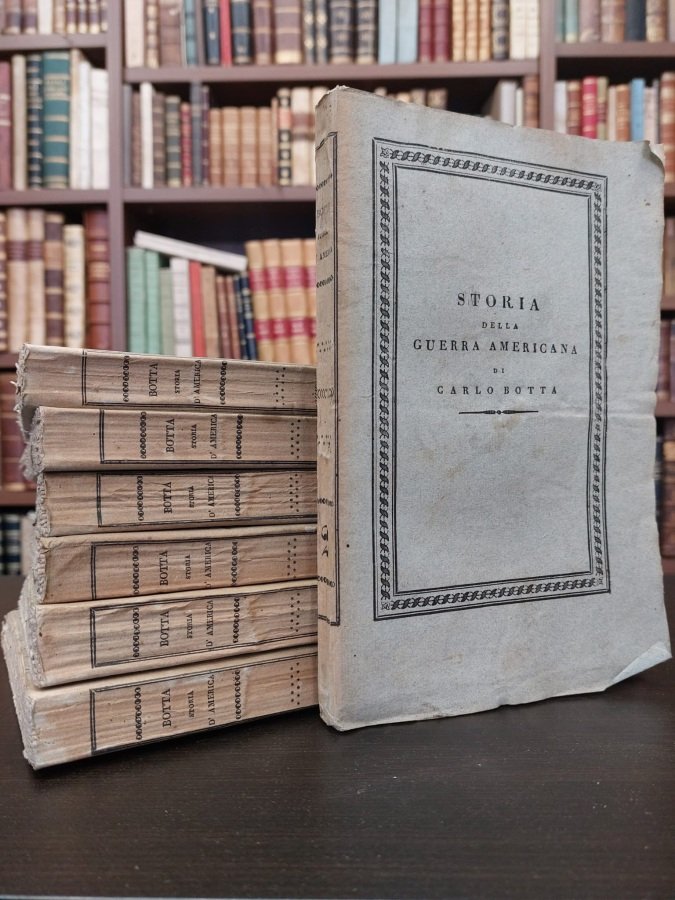 7 volumi in-8° (cm. 21,9), brossure editoriali a stampa azzurrina con titoli in nero ai dorsi e ai piatti anteriori inquadrati da cornici ornate, vignette silografiche ai piatti posteriori (lievi bruniture); carte in stato molto buono (minime e sporadiche fioriture). Edizione livornese di questa celebre opera storica in 14 libri del Botta, probabilmente la più pregevole ed importante monografia sul tema sino ad allora pubblicata, la cui narrazione corre dall'arrivo di La Fayette negli Stati Uniti fino al 1783. L'esaltazione della rivoluzione americana, delle lotte indipendentistiche dei padri fondatori degli Stati Uniti servono indirettamente al Botta come modello per patrocinare la causa patriotica dell'Italia e a polemizzare con la Francia; Washington è incensato in chiave polemica contro Napoleone come modello di autentico rivoluzionario. Lo storico canavesano redasse l'imponente lavoro su materiali di primissima mano, ossia documenti, lettere, topografie diari, opuscoli talora fornitigli dallo stesso La Fayette, e interrogando di persona svariati testimoni degli eventi raccontati. Cfr. Brunet I, 1144; Graesse I, 505; Olschki 830 (ed. milanese del 1819); Gamba 2551-52. Antiche firme di possesso ai contropiatti. Buon esemplare. (SP1)