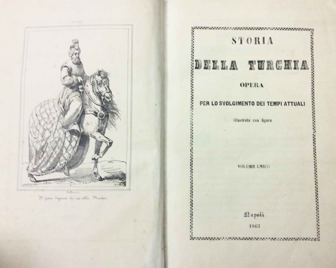 In-8 gr. (mm. 260x166), tela mod., titolo oro al dorso, pp. (2),496, con 18 (su 102) tavole litografate fuori testo che raffigurano vedute e personaggi locali. La Turchia nella sua storia, religione, usi, costumi ed arte. Cfr. ICCU.Solo una tav. sciupata, altrimenti ben conservato.