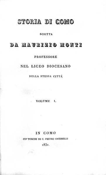In-8 p. (mm. 221x130), 2 volumi in 3 tomi, p. pelle coeva, delicata cornice dorata ai piatti (uno con alone), pp. XXVI,565; 452,(4); 894 (numerazione continua). L'opera, oltre alle vicende storiche di Como, contiene informazioni sui monumenti e le opere d'arte della città e tratta anche le scienze e la letteratura. L'ultima parte riguarda gli aspetti geografici e fisici di Como e del suo territorio. Questo esemplare è unico perchè porta, alla fine del 3° tomo, tre pagine manoscritte - a firma Maurizio Monti / di Brunate - intitolate Ritrattazione dell'autore sulla Storia di Como, in cui condanna e chiede perdono alla Chiesa, a partire dal suo Vescovo, per tutto quanto di irriverente ha potuto scrivere contro i suoi membri (datate Como, 15 Settemb. 1835).Con fioriture marginali, ma complessivamente un buon esemplare.