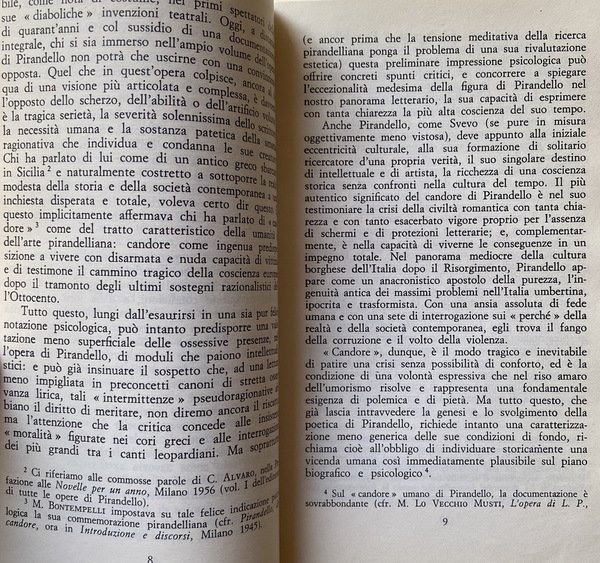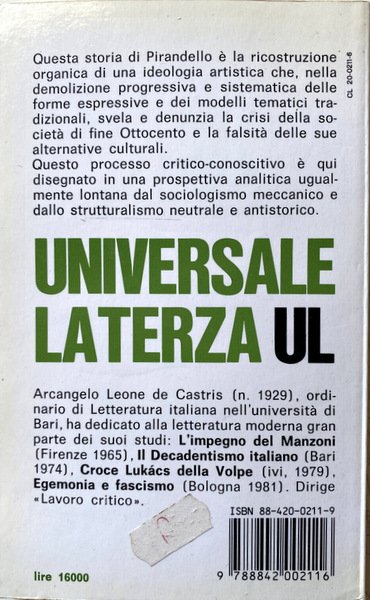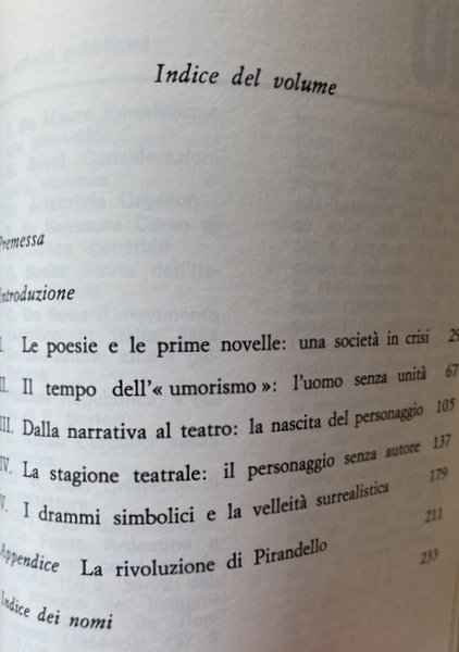 Soggetti: Studi letterari, Italianistica, Critica letteraria, Letteratura italiana, Classici, Bibliografia, Riferimento, Consultazione, Testi, Storia, Teoria, Teatro, Saggi, Biografie, Autobiografie, Memorie, Sicilia, Intellettuali, Romanzi, Novelle, Primo Novecento, Crisi, Cultura, Società, Fascismo, Poetica, Benedetto Croce, Ragione tradizionale, Alienazione idealistico-borghese, Borghesia, Assurdo, Gabriele D'Annunzio, Verga, Umorismo, Ironia, Forma, Personaggi in cerca di autore, Metafore, Falsità, Realtà, Tragedia pirandelliana, Apparenza, I vecchi e i giovani, Fu Mattia Pascal, Identità, Esclusa, Sarcasmo, Autoironia, Interpretazione, Simbolismo, Provincia italiana, Follia, Linguaggio, Ambiente sociale, Commedia borghese, Palcoscenico, Unità, Persona, Individuo, Lotta, Libertà, Doppio, Maschera, Fuga, Così è se vi pare, Enrico IV, Relativismo, Fasci siciliani, Mistificazione, Decadentismo italiano, Romanzo, Coscienza, Retorica, Sentimenti, Personaggio, Uno, Nessuno, Centomila, Dialettica, Funzione, Italo Svevo, Poesie, Novelle, Vita, Drammi simbolici, Surrealismo, Rivoluzione, Narrativa, Pregiudizio, Filosofia, Condanna, Bando, Censura, Sofismi, Alvaro, Bontempelli, Critici, Candore, Forma, Plebe, Popolo, Povertà, Malgoverno, Socialismo, Riscatto sociale, Famiglia, Relazioni, Corruzione, Coscienza, Miseria siciliana, Naturalismo, Sciascia, Formazione culturale, Opere, Janner, Nardelli, Luigi Russo, Salinari, Moliere, Gramsci, Musti Lo Vecchio, Adorno, Auerbach, Bergson, Debenedetti, Della Volpe, Di Pietro, Ferrante, Caos, Farsa, Dissacrazione, Demistificazione, Rovescio, Polemiche, Psicologia, Intuizione, Etica, Libri Vintage Fuori catalogo, Libri usati come nuovi, Literary Studies, Italian Studies, Literary Criticism, Italian Literature, Classics, Bibliography, Reference, Consultation, Texts, History, Theory, Theater, Essays, Biographies, Autobiographies, Memories, Sicily, Intellectuals, Novels, Novels, Early Twentieth Century, Crisis, Culture, Society, Fascism, Poetics, Traditional reason, Idealistic-bourgeois alienation, Bourgeoisie, Absurd, Humor, Irony, Form, Characters seeking an author, Metaphors, Falsehood, Reality, Pirandellian tragedy, Appearance, The old and the young, Identity, Excluded, Sarcasm, Self-irony, Interpretation, Symbolism, Italian province, Madness, Language, Social environment, Bourgeois comedy, Stage, Unity, Person, Individual, Fight, Freedom, Double, Mask, Escape, So if you like, Henry IV, Relativism, Sicilian fasces, Mystery, Italian decadentism, Novel, Consciousness, Rhetoric, Feelings, Character, One, Nobody, One hundred thousand, Dialectic, Function, Poems, Short stories, Life, Symbolic dramas, Surrealism, Revolution, Narrative, Prejudice, Philosophy, Condemnation, Ban, Censorship, Sophisms, Critics, Candor, Form, Plebs, People, Poverty, Bad governance, Socialism, Social redemption, Family, Relations, Corruption, Consciousness, Sicilian misery, Naturalism, Cultural education, Works, Farce, Desecration, Demystification, Reverse, Controversies, Psychology, Intuition, Ethics, Out of print books, Used books as new