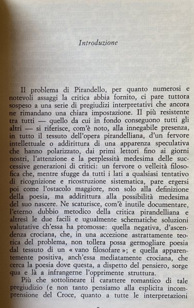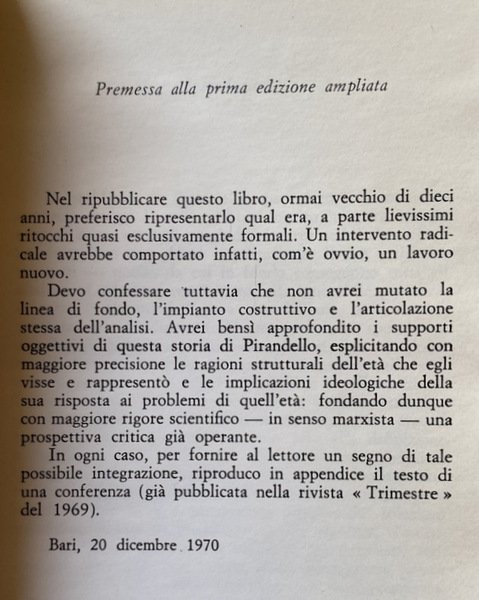 Questa storia di Luigi Pirandello è la ricostruzione organica di una ideologia artistica che, nella demolizione progressiva e sistematica delle forme espressive e dei modelli tematici tradizionali, svela e denunzia la crisi della società di fine Ottocento e la falsità delle sue alternative culturali. Questo processo critico-conoscitivo è qui disegnato in una prospettiva analitica ugualmente lontana dal sociologismo meccanico e dallo strutturalismo neutrale e antistorico.