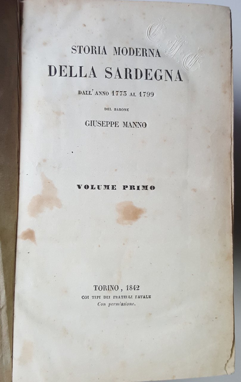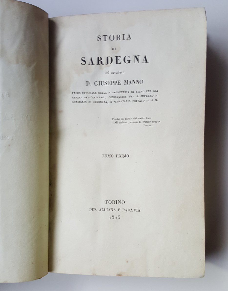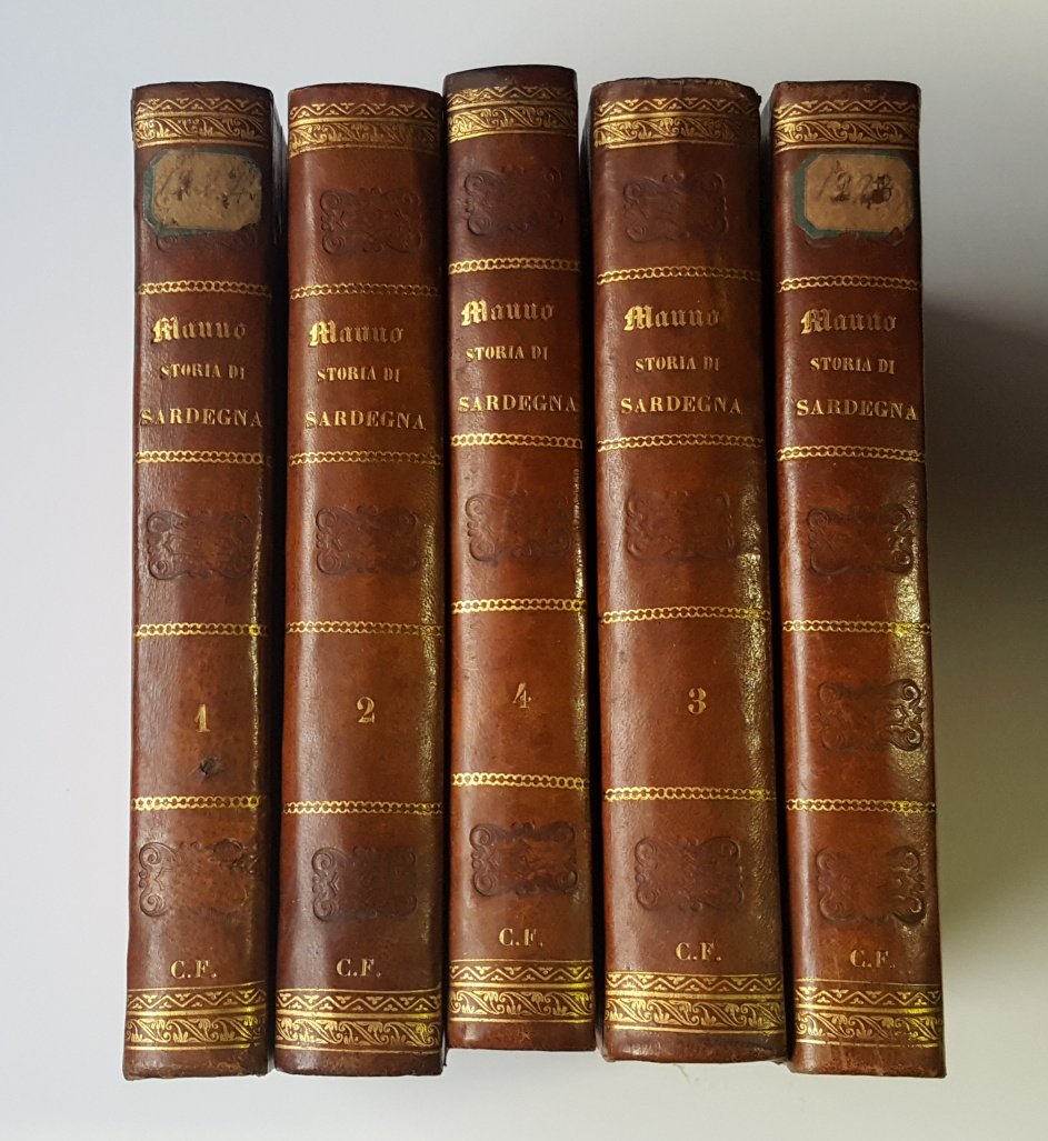 >5 volumi in-8, legature uniformi coeve in m.pelle, titolo, fregi in oro al dorso. I) 4 vol. in-8, pp. 329, XXXV; 423, XII; 540; 370, (2 di errata). In antip. al vol.I ritratto dell'artista in litogr. Prima edizione. II) 2 vol. in un tomo in-8, pp. XII, 272, (4); 262, ben leg. m.pelle coeva, tit. e fregi in oro al dorso. Prima edizione. Non comune. Bell'esempl., con lievi fioriture e qualche alone, di assieme fondamentale nella storiografia sarda, in rilegatura uniforme.Tralasciando i tempi favolosi, il Manno (Alghero 1786 - Torino 1868, figura di notevole spicco nella vita culturale e politica del Regno), tratta l'argomento dalla colonizzazione fenicia alla morte di Carlo Emanuele III nel 1775. Il suo studio fu di stimolo per nuove approfondite ricerche di altri autori, e rimane tuttora insuperato per la sua organicità, l'uso scrupoloso delle fonti documentarie, la curata forma letteraria e non è ancora stato sostituito da altra opera di sintesi. Dopo essersi occupato per lo più di letteretura, il Manno riprese il tema storico, narrando diffusamente le vicende rivoluzionarie dell'isola sino all'arrivo di Carlo Emanuele IV, basandosi sulla ricca documentazione fornita dallo stesso governo sardo e da archivi regionali e privati. Ciasca 10460 e 10462. Lozzi 4833.