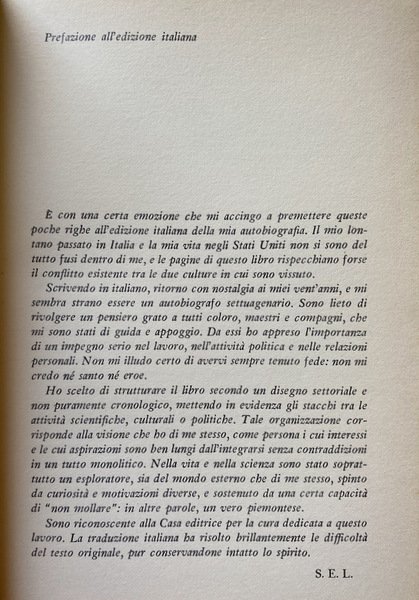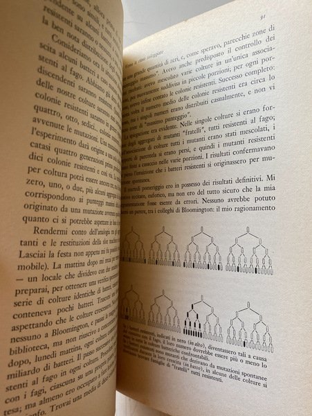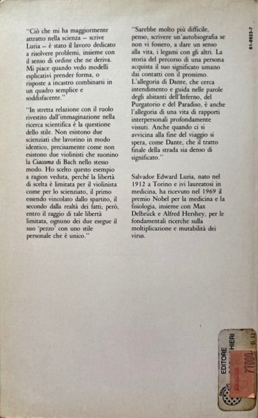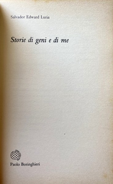 Soggetti: Biografie, Memorie, Autobiografia, Medicina, Scienziati italoamericani, Microbiologia, Premio Nobel, Virus, Fisica, Fagi, Moltiplicazione, Scoperte scientifiche, Biologia molecolare, Scienza della vita, Genetica, Teorie, Divulgazione scientifica, Scienze biologiche, Opere divulgative, Autobiografie, Stephen Jay Gould, Sam Singer, Geni, DNA ricombinante, RNA, Genoma, Codice genetico, Trasmissione, Ereditarietà, Ricerca scientifica, Virologia, Mutabilità, Università, Impegno politico, Pensiero scientifico, Homo sapiens, Intellettuali, Bibliografia, Studi scientifici, Riferimento, Libri rari, Collezionismo, Libri Vintage Fuori catalogo, Carriera, Allievi, Maestri, Accademici, Batteriologia, Ingegneria genetica, Max Delbrück, Alfred Hershey, James Dewey Watson, Renato Dulbecco, Linus Pauling, Batteri, Malattie, Dissenteria, Shigella, Medicina, Fisiologia, Richard Nixon, Vietnam, Pacifismo, Pacifisti, Anni Sessanta, America, Antifascismo, Slot machines, Test di fluttuazione, Escherichia coli, Mutazioni, Metilazione, Colture, Resistenza, Antibiotici, Mussolini, Leggi razziali, Antisemitismo, Fascismo, Anni Quaranta, Anni Cinquanta, Raggi X, Raggi alfa, MIT, Boston, Columbia University, David Baltimore, Radiologia, Enrico Fermi, Gruppo del fago, James Watson, Francis Crick, Batteriofagi, Ebrei italiani, Emigrati, Aneddoti, Curiosità, Anni giovanili, Zella Hurwitz, Guerra Fredda, Manifesto della Razza, Bronowski, Monod, Amicizie, Letteratura, Libri da collezione, Biographies, Memories, Autobiography, Medicine, Italian American scientists, Microbiology, Nobel Prize, Viruses, Physics, Phages, Multiplication, Scientific discoveries, Molecular biology, Life science, Genetics, Theories, Scientific dissemination, Biological sciences, Popular works, Autobiographies, Genes, Recombinant, Genome, Genetic code, Transmission, Inheritance, Scientific research, Virology, Mutability, University, Political commitment, Scientific thinking, Intellectuals, Bibliography, Scientific studies, Reference, Rare books, Collecting, Out of print books, Career, Students, Masters, Academics, Bacteriology, Genetic engineering, Bacteria, Diseases, Dysentery, Medicine, Physiology, Pacifism, Pacifists, Sixties, Antifascism, Fluctuation, Mutations, Methylation, Crops, Resistance, Antibiotics, Racial laws, Anti-Semitism, Fascism, Forties, Fifties, X-rays, Radiology, Phage group, Bacteriophages, Italian Jews, Emigrants, Anecdotes, Curiosities, Early years, Cold War, Manifesto of the Race, Friendships, Literature, Autobiographies, Collectible books