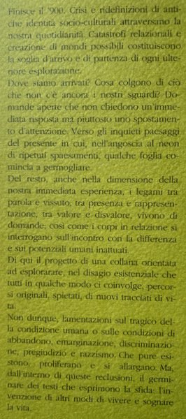 Del resto, anche nella dimensione della nostra immediata esperienza, i legami tra parola e vissuto, tra presenza e rappresentazione, tra valore e disvalore, vivono di domande; così come i corpi in relazione si interrogano sull'incontro con la differenza e sui potenziali umani inattuati. Di qui il progetto di una collana orientata ad esplorare, nel disagio esistenziale che tutti in qualche modo ci coinvolge, percorsi originali, spietati, di nuovi tracciati di vita.