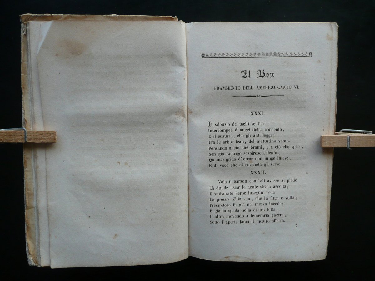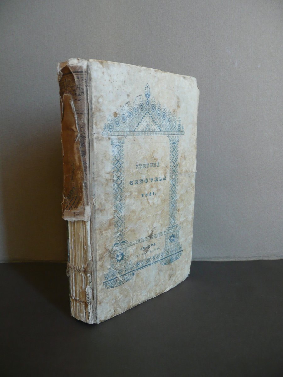 Strenna, Strenna genovese pubblicata da Giacomo Cevasco a beneficio della Scuola Infantile di S. Sofia Anno primo 1841 Tip. e Lit. Ponthenier, Genova 1841, cm 14x9, pp. I-XIX; pp. 1-276; tutto cartonato ed. con alcuni fregi blu ad entrambi i piatti (vedi foto). Condizioni di conservazione: Esemplare in condizioni più che discrete con tracce d'uso e del tempo; alcune leggere bruniture; piatti con qualche minima mancanza, alcuni piccoli difetti e strappetti ai margini e agli angoli; dorzo parzialmente mancante e con alcuni strappetti, ma oggetto di vecchio restauro per mezzo d'incollatura; esemplare complessivamente compatto. Qualche pagina con una lieve ombra di gora d'umidità che non compromette la lettura del testo. Antiporta con alcune piccole mancanze. SETT89.L8144 P/ST40