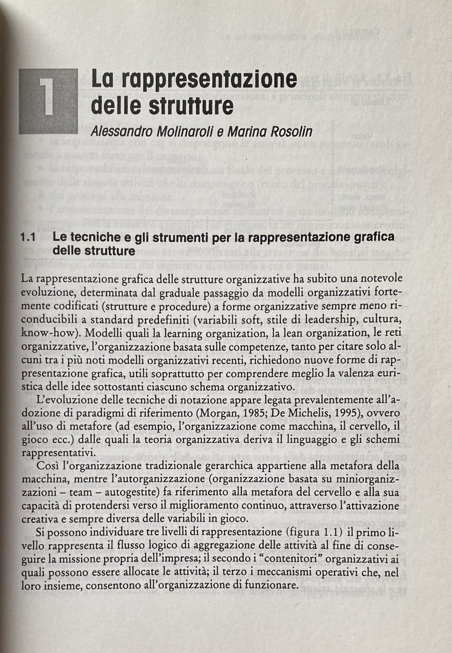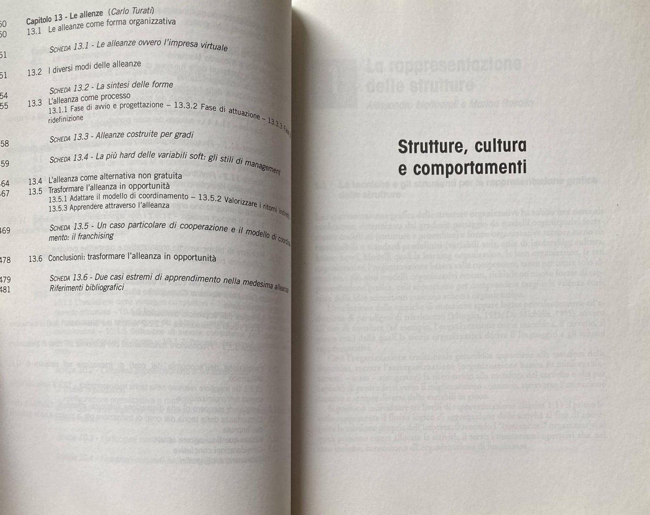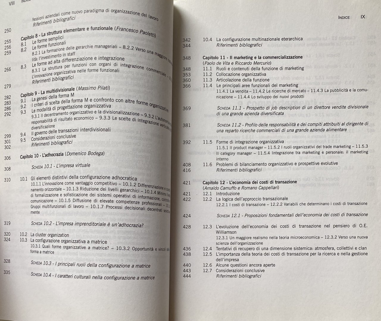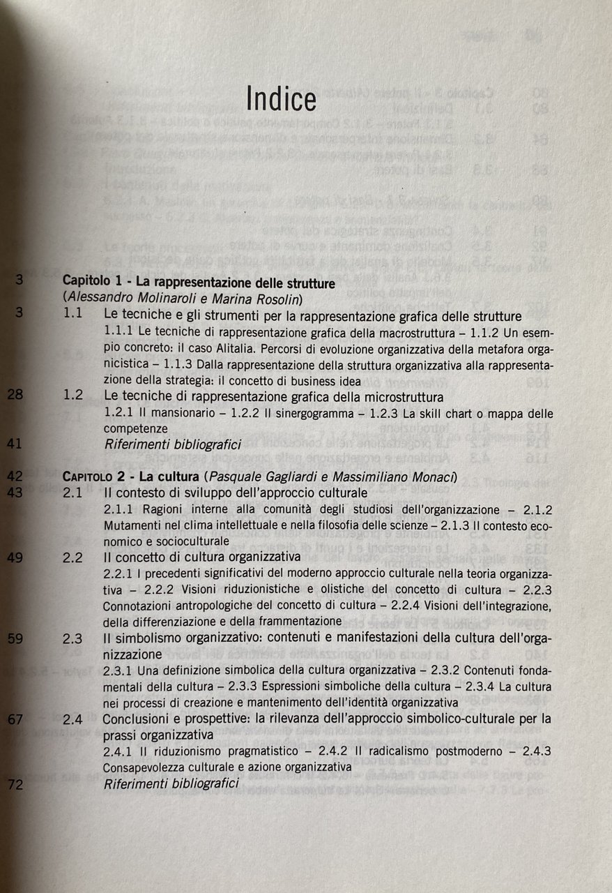 Soggetti: Manuali universitari, Economia aziendale, Impresa, Strategia, Gestione, Amministrazione, Comunicazione, Marketing, Management, Diritto, Lavoro, Studi generali, Bibliografia, Riferimento, Libri fuori catalogo, Università, Teoria organizzativa, Manager, Prassi manageriale, Tecnologie informatiche, Comportamento, Tattiche politiche, Strumenti, Microstrutture Casi studio Alitalia Idea Business Piano industriale Previsioni Grafica Rappresentazione Skill chart Sinergogramma Mansionario Mappa Competenze Filosofia delle scienze Organizzazione scientifica Teorie processuali sociologiche economiche Differenziazione Integrazione Cultura Mentalità Radicalismo postmoderno Riduzionismo Pragmatismo Fattibilità Potere Analisi Decisioni Modelli tradizionali Ambiente Progettazione Concezioni reticolari Sistemi Direzione Taylor Fayol Max Weber Burocrazia McClelland Alderfer E.E. Lawler Victor Vroom J.S. Adams F. Herzberg R. Likert D. McGregor Chris Argyris Gruppi Citizenship Ruoli Task Attività Paradigma Sociotecnica Italia Flessibilità Figure professionali Motivazione Sviluppo Soddisfazione Gerarchia Bisogni Aspettative Divisione Forme semplici Innovazione Vantaggio competitivo Valutazione Risorse umane Risultati Adhocrazia Matrice Commercializzazione Category Trade Ricerche di mercato Consumi Nuovi prodotti Costi Transazione Variabili O.E. Williamson Startup Alleanze Avvio Franchising Cooperazione Competitività Leadership Know how Servizi Procedure Esperienza Coordinamento Controllo Flessibilità Psicologia Partecipazione Collaborazione Rigidità Organizational climate Mappa cognitiva Thorndike Merton Affidabilità Circolo vizioso Comportamentismo Clienti Relazioni Gouldner Urwick Simon Autorità Equità Comando Accentramento Disciplina Responsabilità Ordine Dipendenti Personale Armonia Interesse Mobilità Vendite Fatturato Obiettivi Target Rivalità Competitor Ricavi Profitto Investimenti Mansioni Pubblicità Consulenze Promozioni Crescita Goal Setting Procedural Justice Mayo Herzberg Seiler Lawrence Lorsche Job Formazione Coaching Training Piramide Maslow Rugiadini Airoldi Brunetti Coda Atkinson Pinder Steer Porter Avallone Ricompensa Incentivi Barnard Enrichment Feedback Status Successo Identificazione Superiori Galbraith Empowerment Regole M. Decastri G. Gabrielli S. Profili Igiene University textbooks Business economics Strategy Management Administration Communication Law Labor General studies Bibliography Reference Books out of print University Organizational theory Managerial practice Information technologies Behavior Political tactics Tools Microstructures Case studies Industrial plan Forecasts Graphics Representation Synergogram Job description Map Skills Philosophy of science Scientific organization Sociological process theories economic Differentiation Integration Culture Mentality Postmodern radicalism Reductionism Pragmatism Feasibility Power Analysis Decisions Traditional models Environment Design Reticular conceptions Systems Management Bureaucracy Groups Roles Activities Sociotechnics Italy Flexibility Professional figures Motivation Development Satisfaction Hierarchy Needs Expectations Division Simple forms Innovation Competitive advantage Evaluation Human resources Results Adhocracy Matrix Commercialization Market research Consumption New products Costs Transaction Variables Alliances Start-up Cooperation Competitiveness Services Procedures Experience Coordination Control Flexibility Psychology Participation Collaboration Rigidity Cognitive map Reliability Vicious circle Behaviorism Customers Relationships Authority Equity Command Centralization Discipline Responsibility Order Employees Staff Harmony Interest Mobility Sales Turnover Objectives Rivalry Competitors Revenues Profit Investments Duties Advertising Consulting Promotions Growth Training Pyramid Rewards Incentives Success Identification Superiors Rules Hygiene