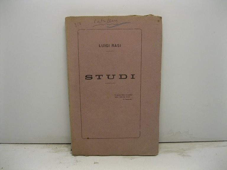 In 16, pp. 139 + (5). Dedica autogr. dell'A. al fr. Br. ed. Rara raccolta di traduzioni catulliane di Luigi Rasi (1852-1918), importante storico del teatro italiano, nonche' maestro di recitazione, e direttore, dal 1882, della Scuola di recitazione di Firenze. Le traduzioni sono precedute da una lettera a Mario Rapisardi.