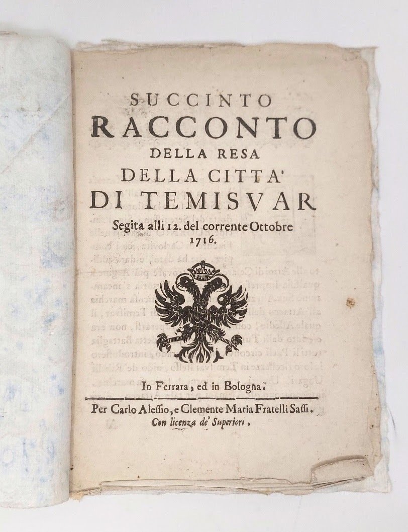 >in-4 (217x154 mm), ff. 2, brossura in carta decorata coeva. Grande aquila a due teste sul frontespizio, frontalino e grande iniziale silografica. L'opuscolo è dedicato agli eventi relativi alla sottomissione del Banato ed in particolare a quelli relativi all'espugnazione della fortezza di Temesvar (14 ottobre 1716). La dominazione austro-ungarica durò più di 200 anni.