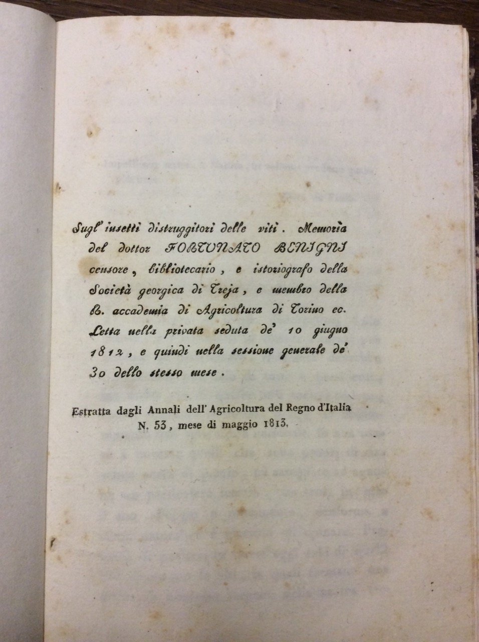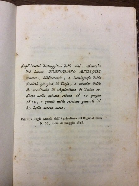 SUGL'INSETTI DISTRUGGITORI DELLE VITI. - Memoria letta nella privata seduta de' 10 giugno 1812, e quindi nella sessione generale de' 30 dello stesso mese. Estratta dagli Annali dell'Agricoltura del Regno d'italia, n. 53, maggio 1813.