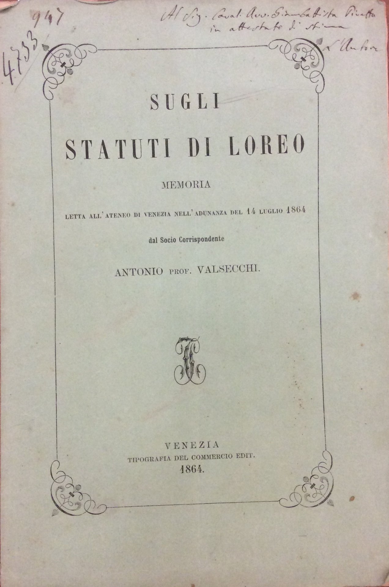SUGLI STATUTI DI LOREO. - Memoria letta all'Ateneo di Venezia nell'adunanza del 14 luglio 1864.