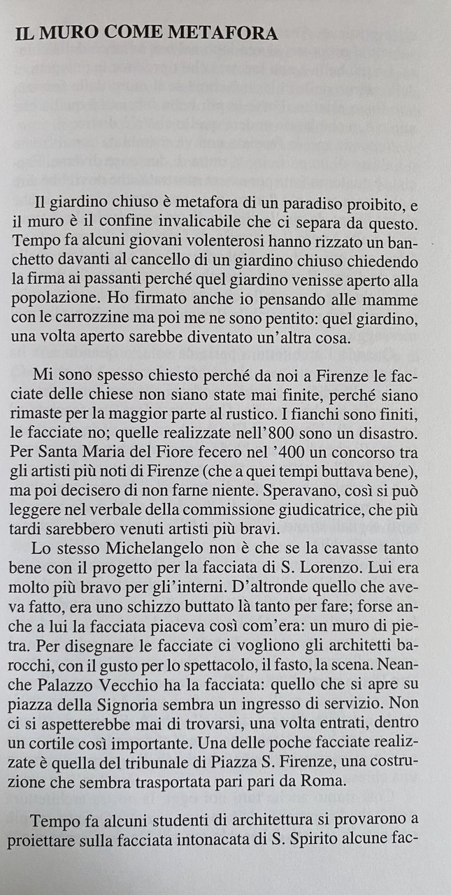 Per un architetto un muro è un manufatto che serve a sostenere, a dividere, a proteggere dal freddo e dal caldo, ma è anche qualcosa di più. Ed è ragionando su questo qualcosa di più che ho scritto il primo di questi ragionamenti fiorentini. L'occasione è nata con la proposta di abbattimento di un muro di un vecchio carcere nel Centro di Firenze. Sembrava che senza quel muro, che chiaramente indicava e delimitava un luogo di pena, in tutta la zona tornasse a sorridere la vita, e insieme il sole e la libertà riconquistata. Questi appunti raccontano dei dubbi che mi sono venuti in testa e che, alla fine, mi hanno convinto a non demolire quel muro.