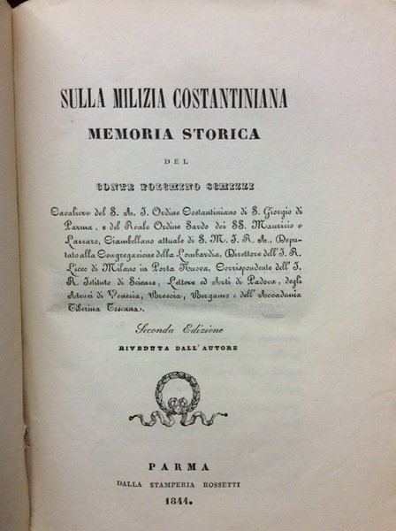 In-8 p. (mm. 220x140), bross., pp. 62,(2), con 4 tavole litografate fuori testo: ritratto (in medaglione) dell'Imperatore Costantino Massimo, stemma dell'Ordine Costantiniano di S. Giorgio, 1 bella tavola a colori che raffigura un Cavaliere in divisa, 1 tavola (ripieg.) con varie decorazioni. Origine della Milizia Costantiniana fino alla cessione fatta al Gran Magistero dell'Ordine da Isacco Commeno a Francesco I Duca di Parma - Restaurazione dell'Ordine fatta dall'Arciduchessa Maria Luigia Duchessa di Parma, Piacenza e Guastalla. Segue elenco dei componenti l'Ordine. Esempl. ben conservato.