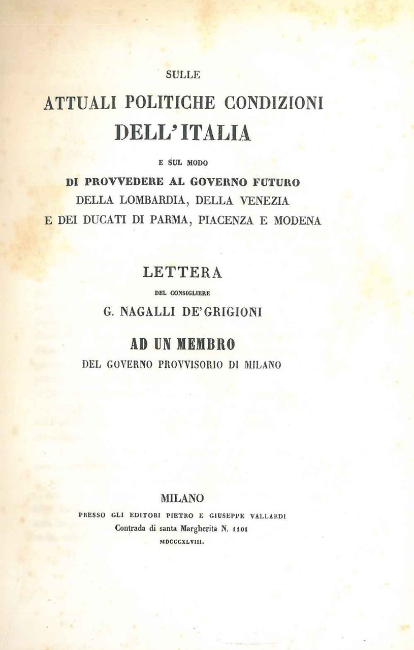 Sulle attuali politiche condizioni dell'Italia e sul modo di provvedere al governo futuro della Lombardia, della Venezia e dei ducati di Parma, Piacenza e Modena. Lettera. ad un membro del Governo provvisorio di Milano
